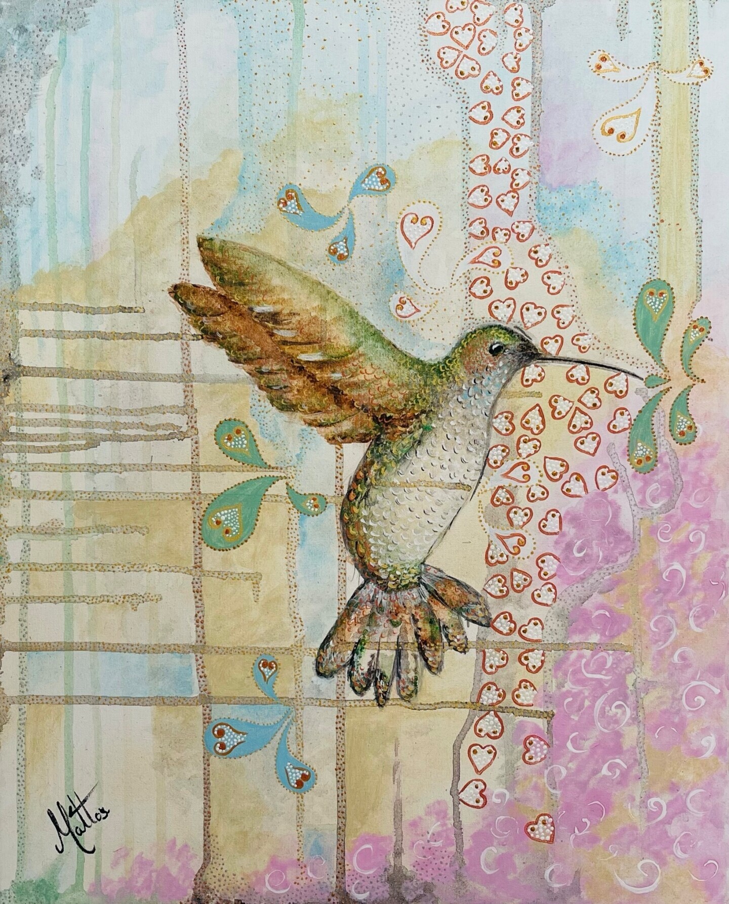 Colibri — peinture colorée d’un colibri en vol, aux plumes finement détaillées mêlant verts, bruns et blancs, posé sur un arrière‑plan pastel parsemé de motifs ludiques; composition légère et dynamique qui évoque mouvement, délicatesse et fantaisie, parfaite pour une collection contemporaine ou une exposition dédiée à la nature stylisée.