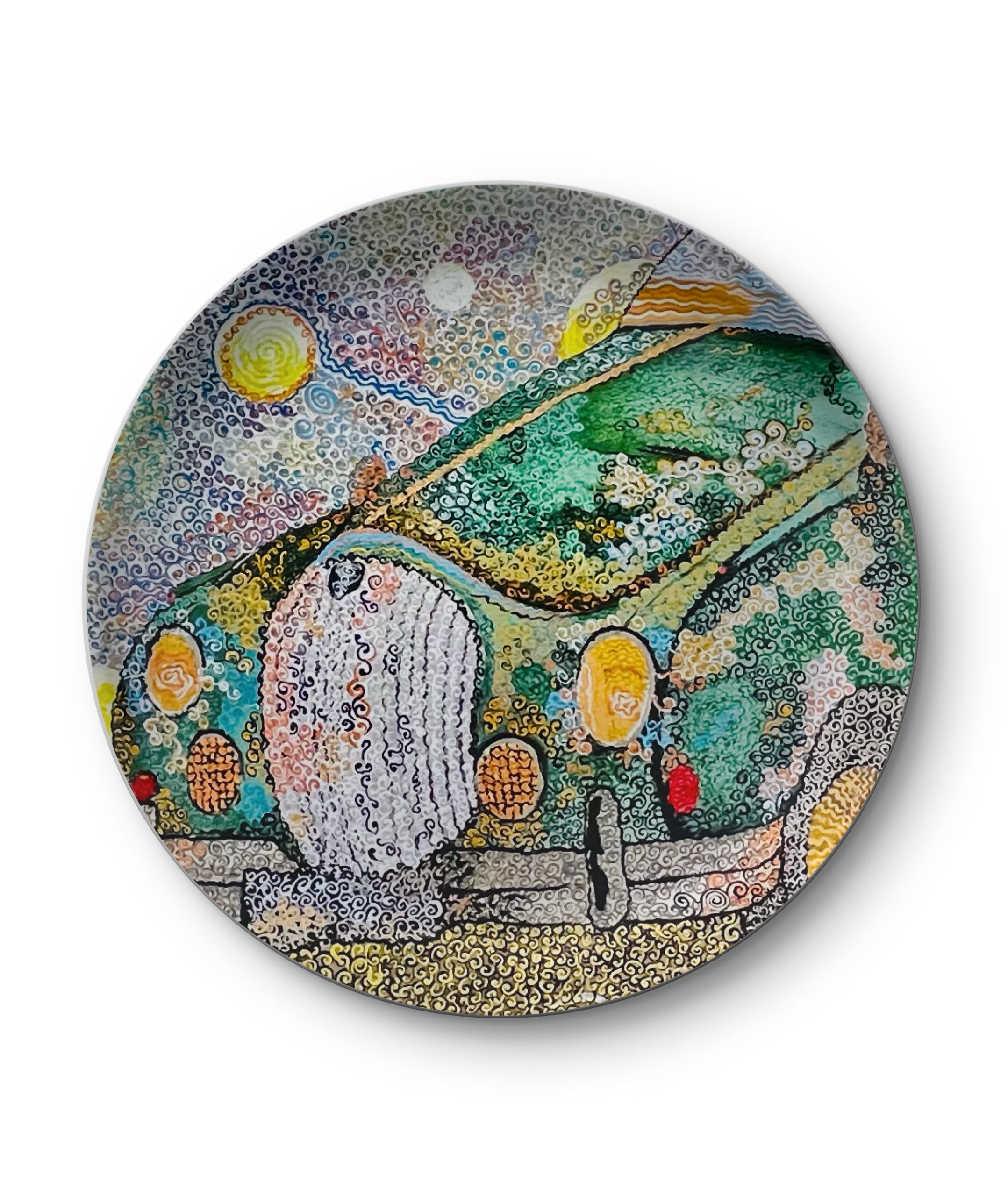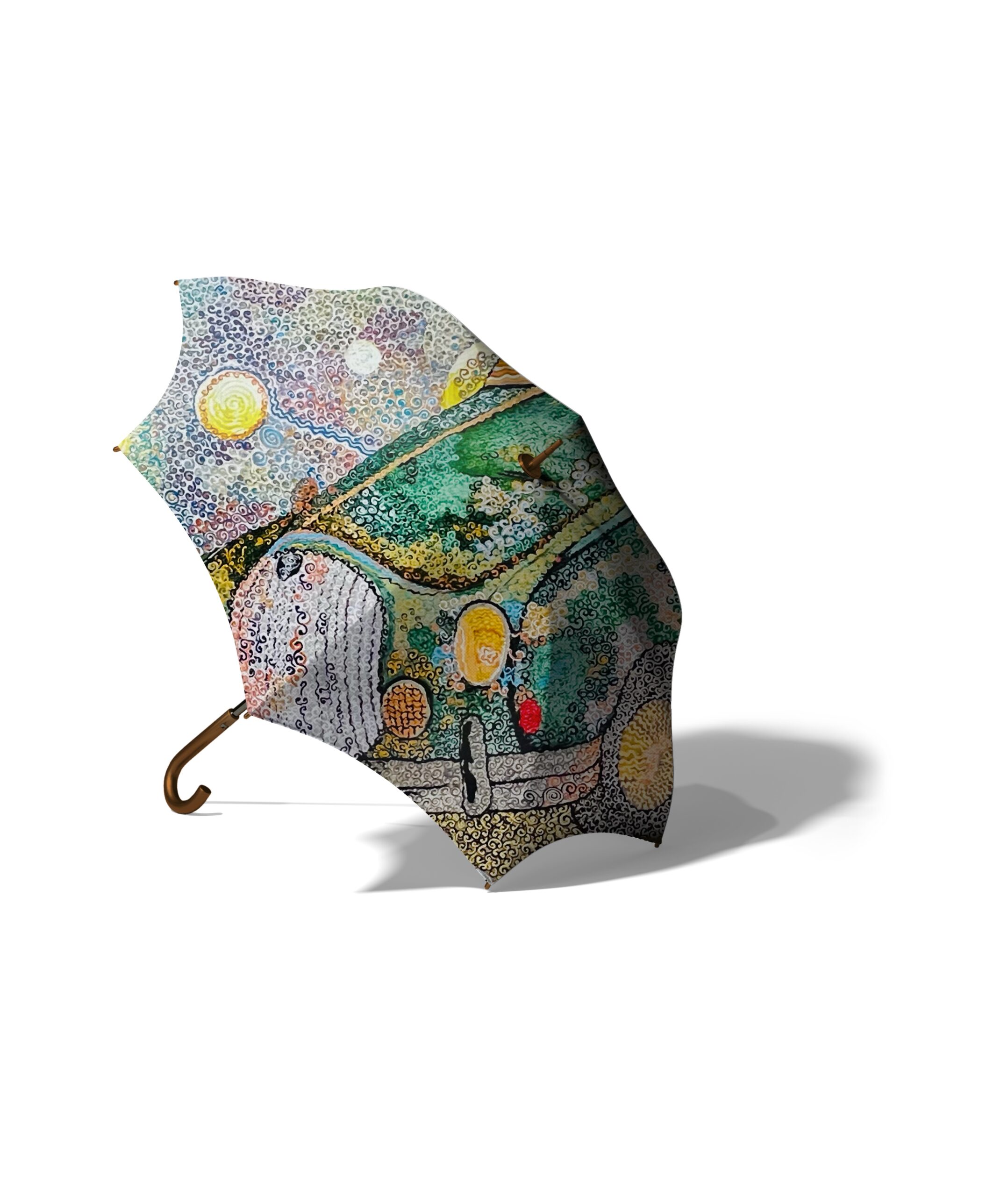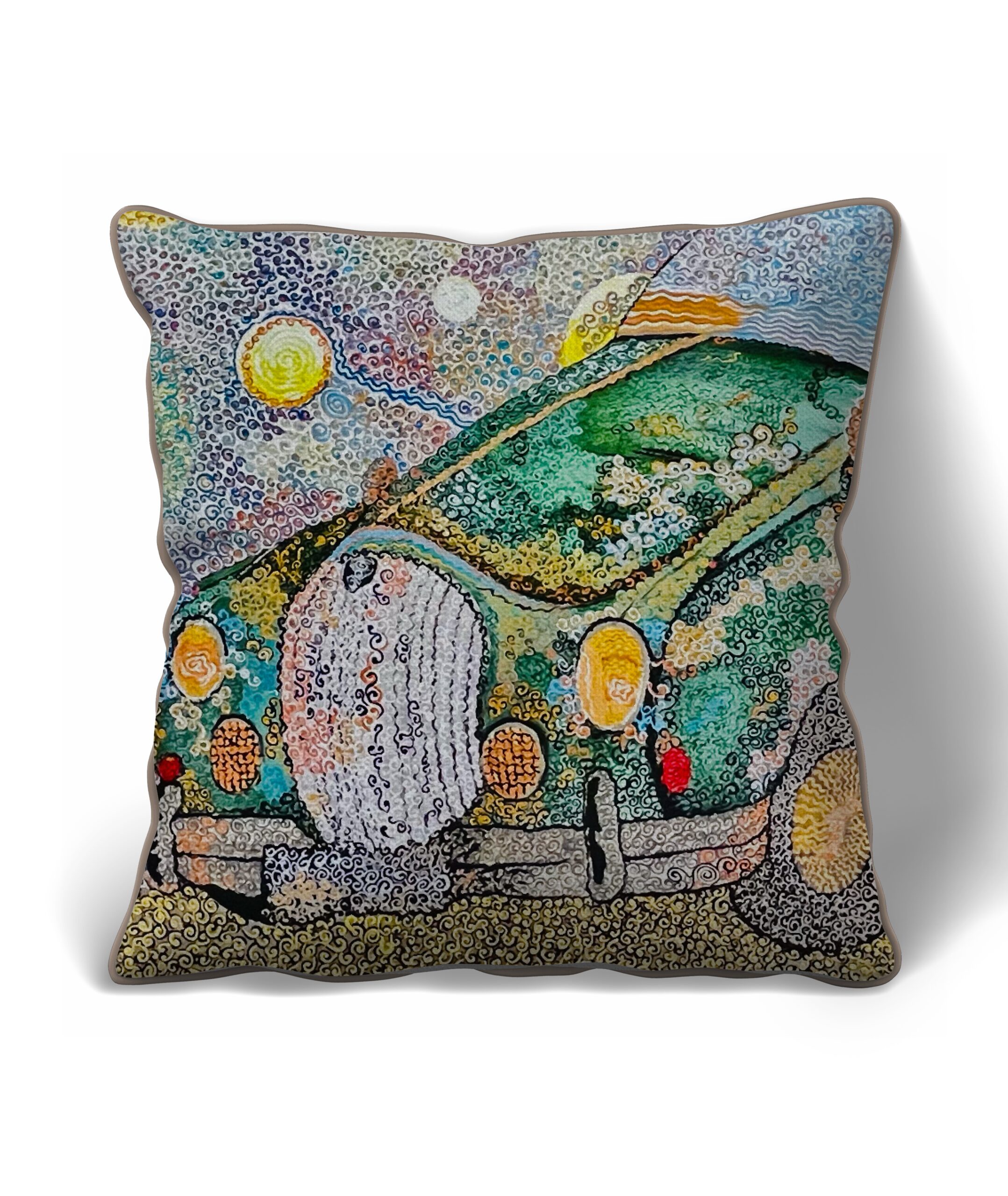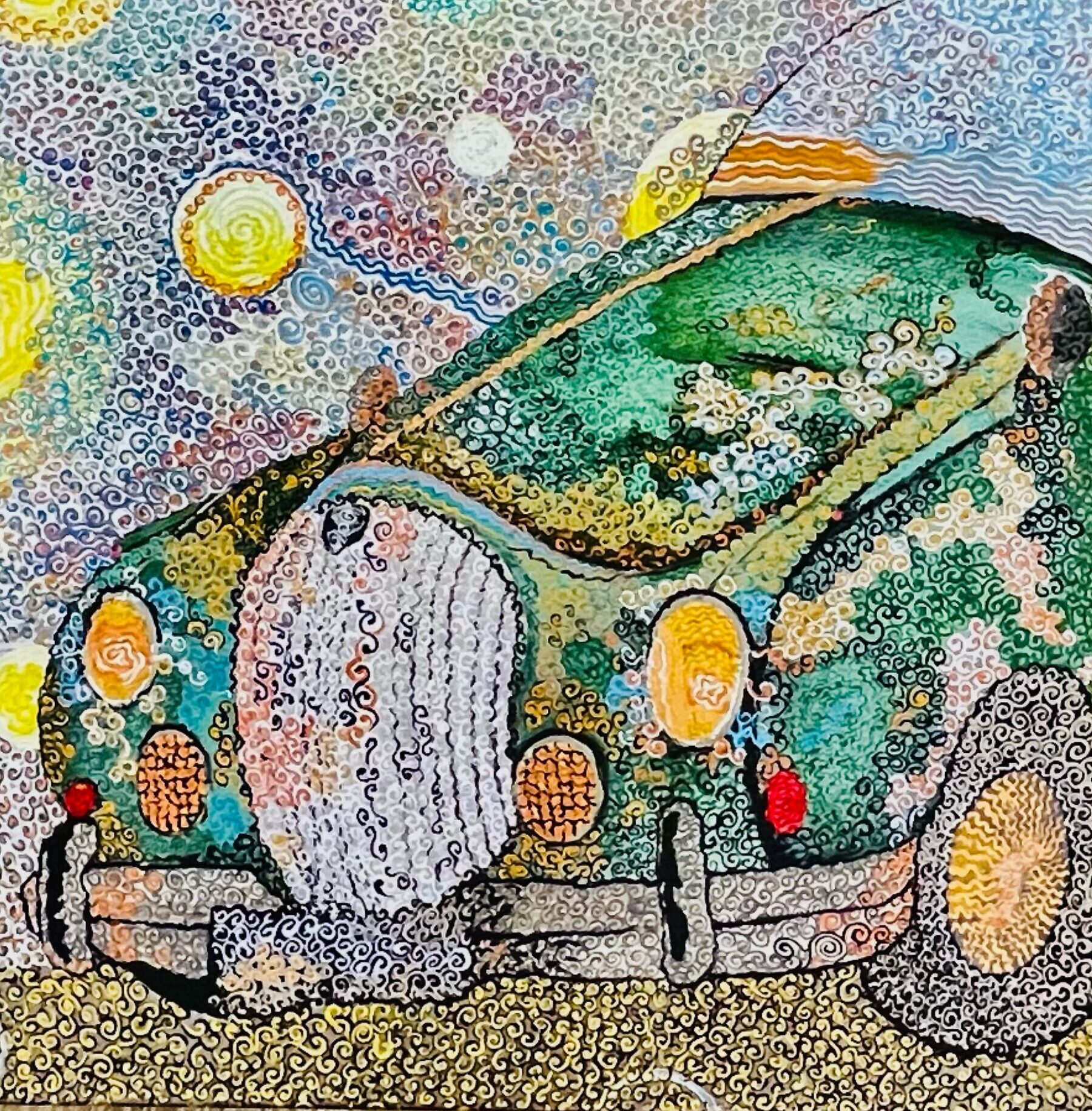 Jaguar — peinture pointilliste représentant une voiture vintage verte, composée de milliers de touches tourbillonnantes; la carrosserie rétro dialogue avec un ciel animé de motifs célestes et d’éléments oniriques, créant une œuvre à la fois nostalgique et dynamique qui célèbre le mouvement, la couleur et l’imaginaire automobile.