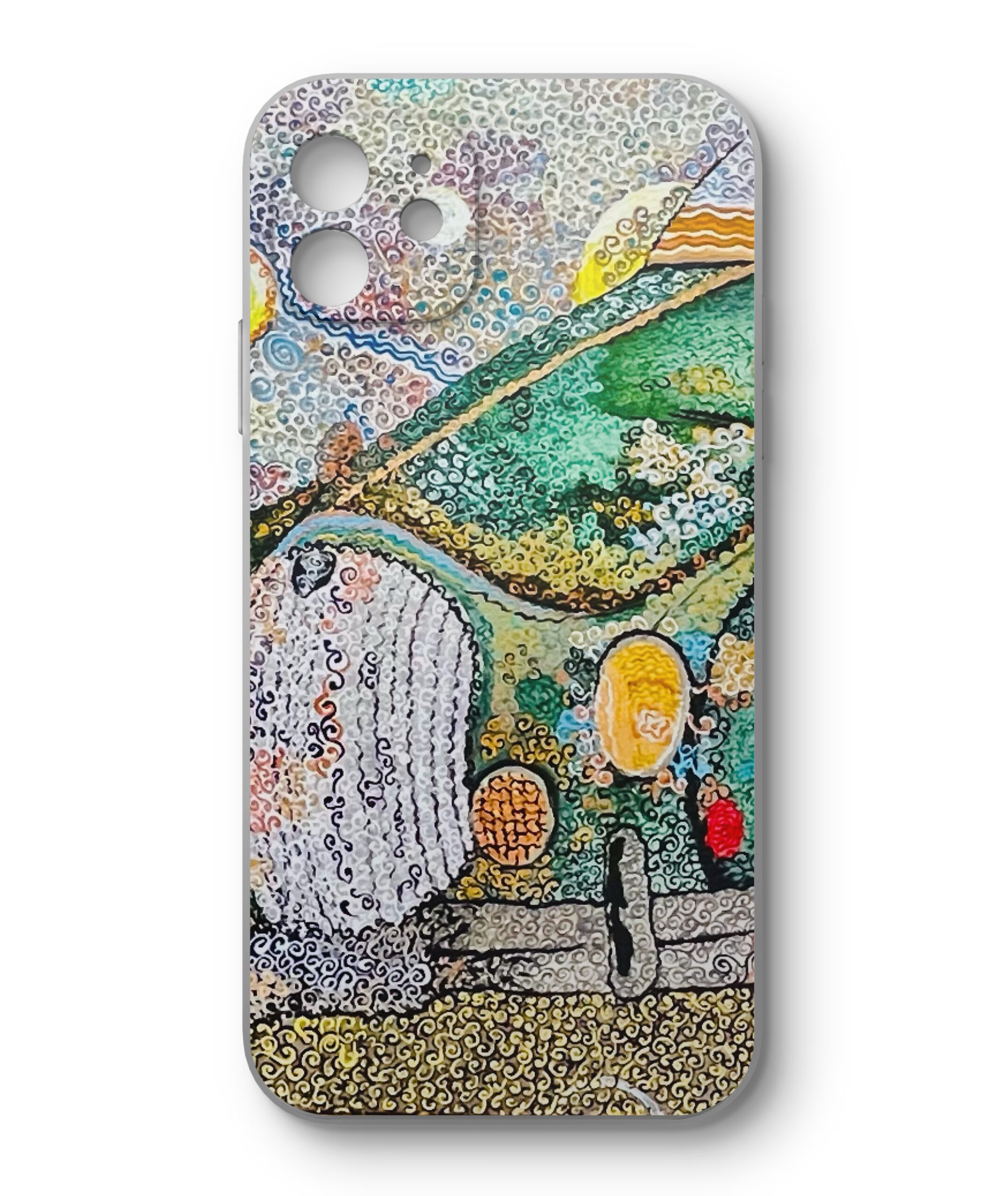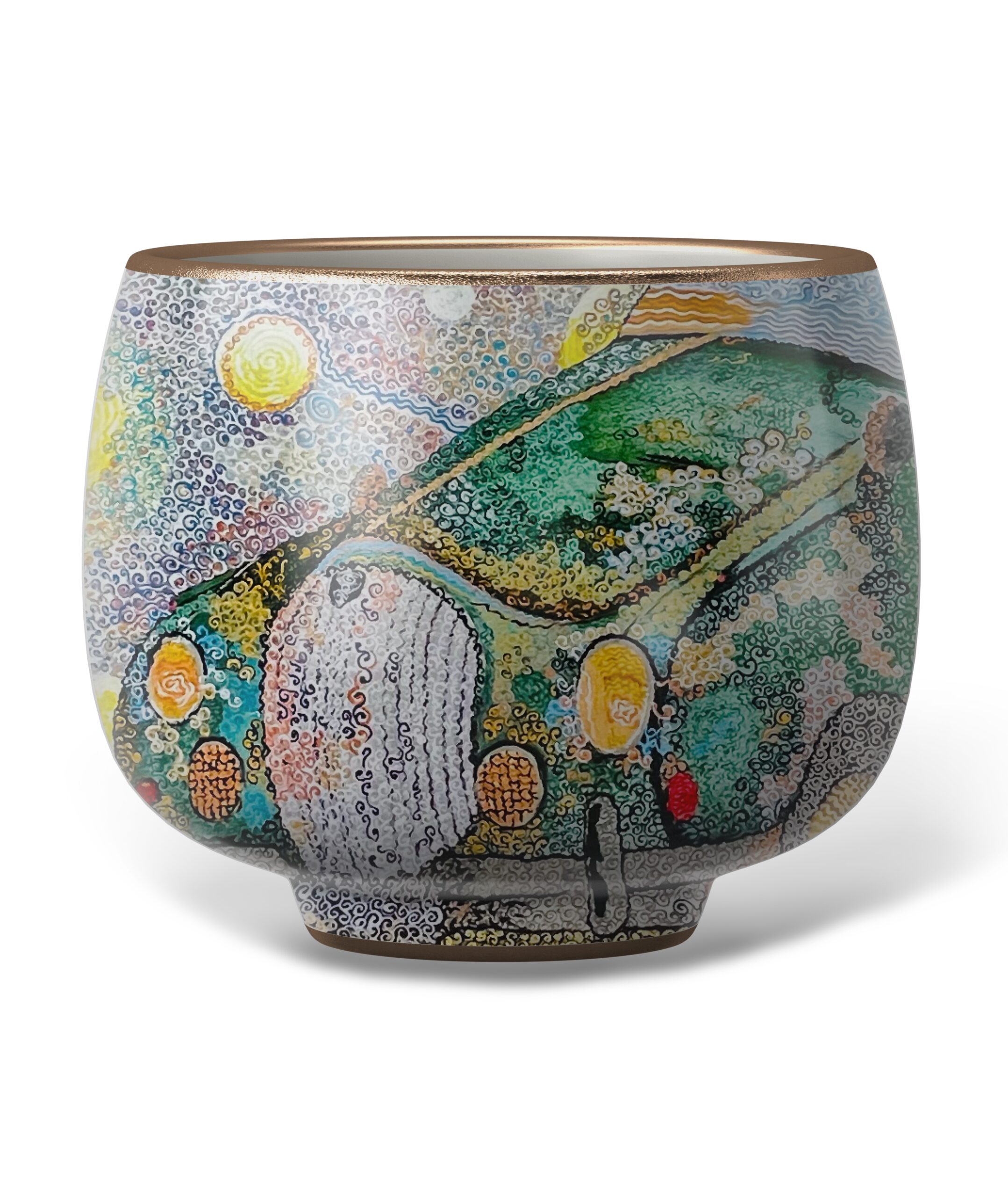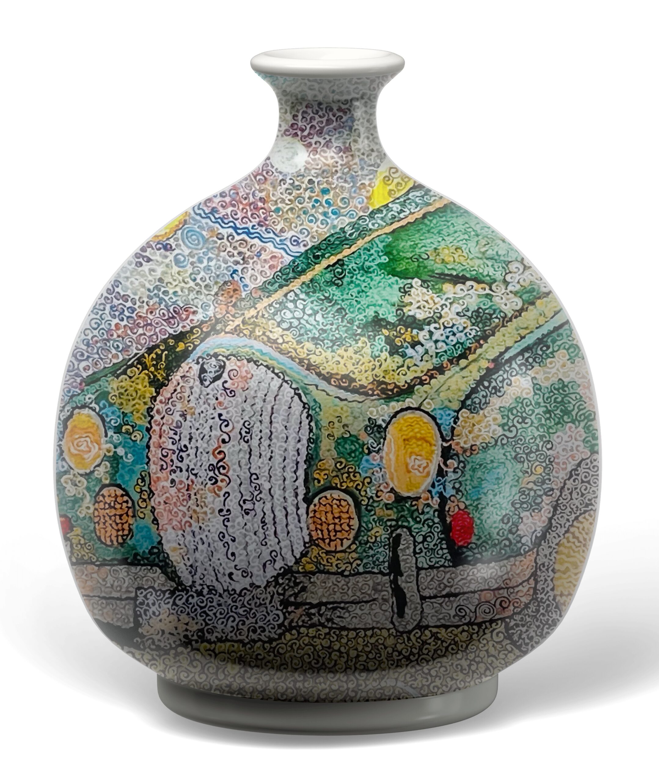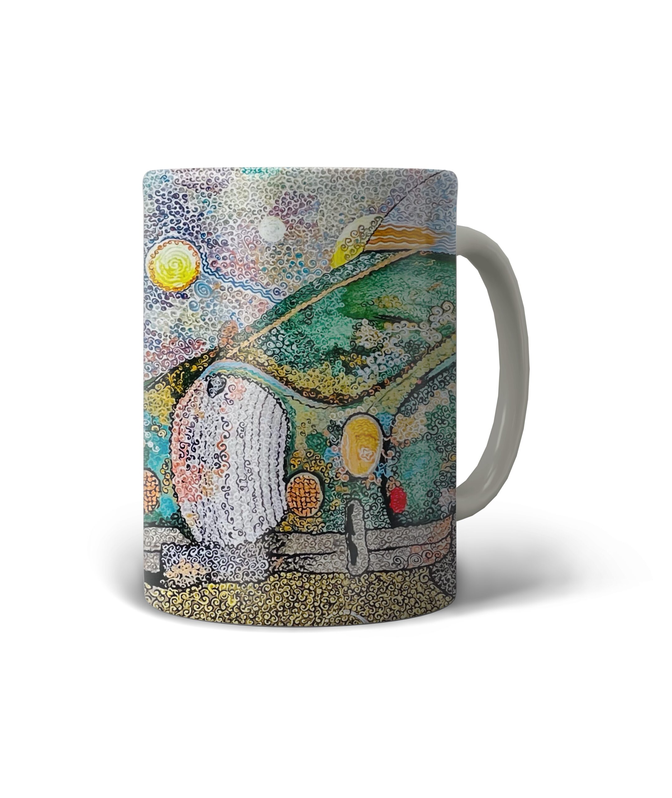 Jaguar — peinture pointilliste représentant une voiture vintage verte, composée de milliers de touches tourbillonnantes; la carrosserie rétro dialogue avec un ciel animé de motifs célestes et d’éléments oniriques, créant une œuvre à la fois nostalgique et dynamique qui célèbre le mouvement, la couleur et l’imaginaire automobile.