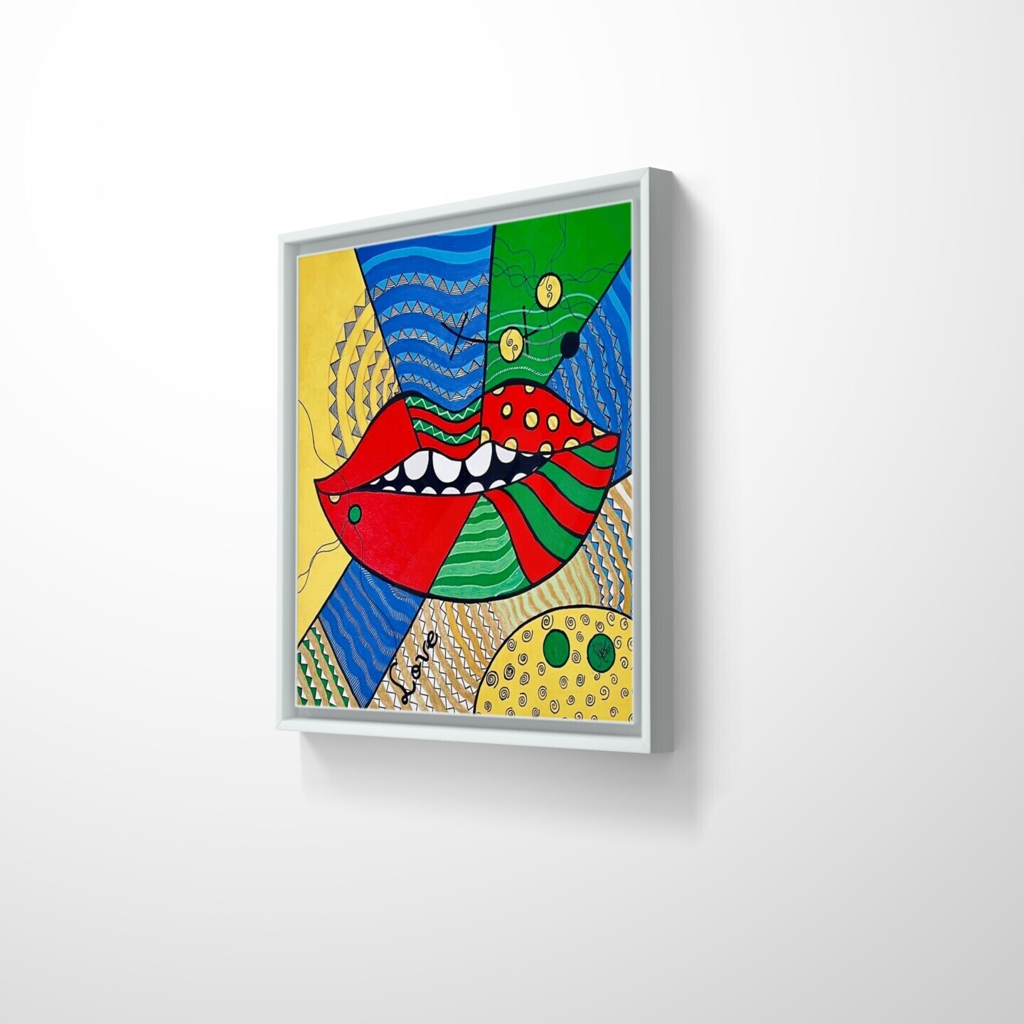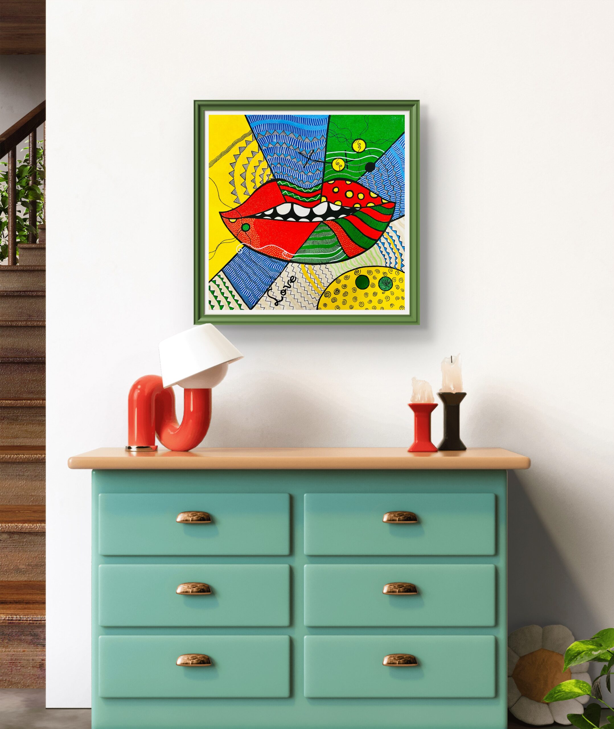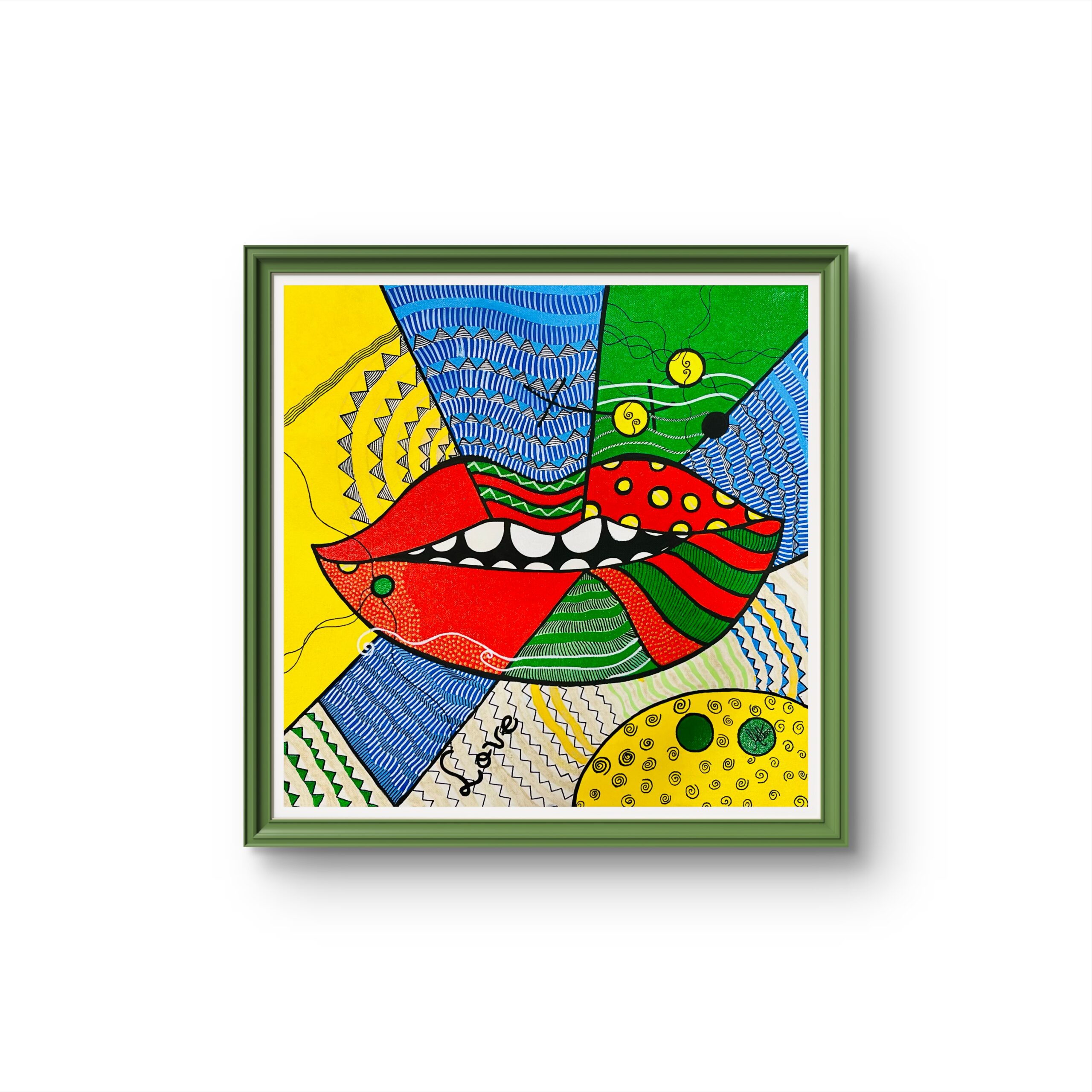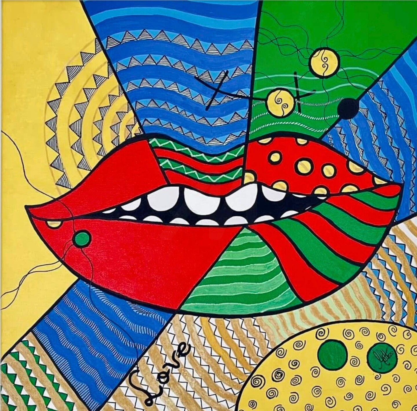 La bouche — peinture pop‑abstraite centrée sur des lèvres rouges et des dents stylisées, entourées de sections géométriques et motifs colorés; contrastes vifs, textures variées et l’inscription manuscrite «Love» ajoutent une dimension émotionnelle et ludique, invitant à une lecture à la fois sensuelle et graphique, parfaite pour une collection contemporaine ou une exposition thématique.