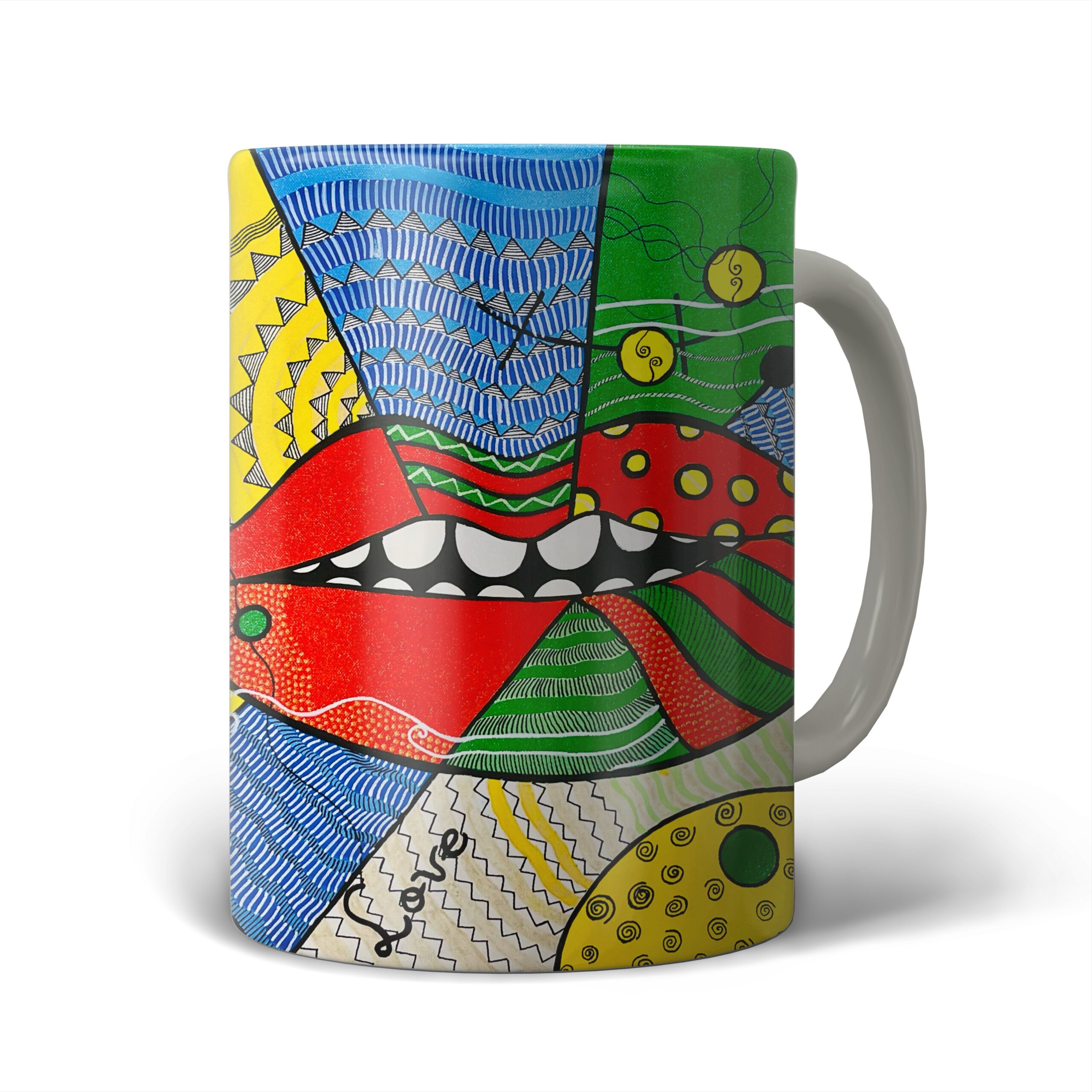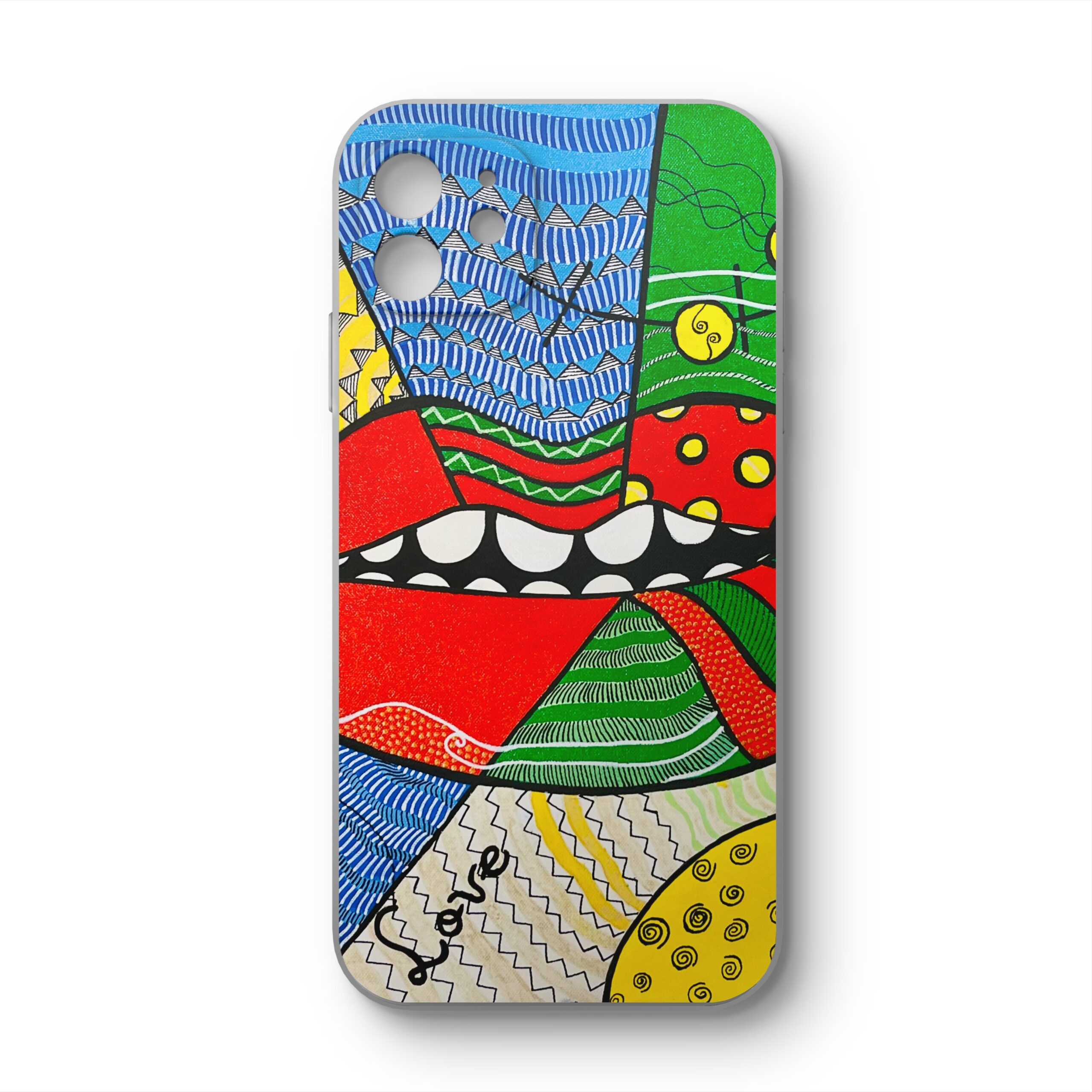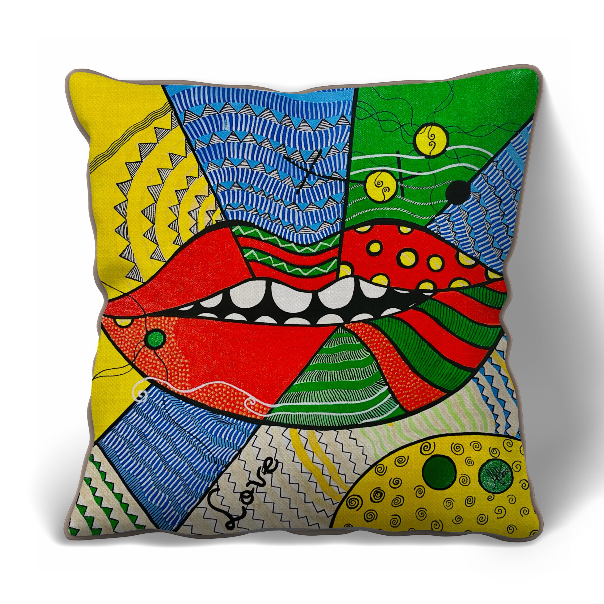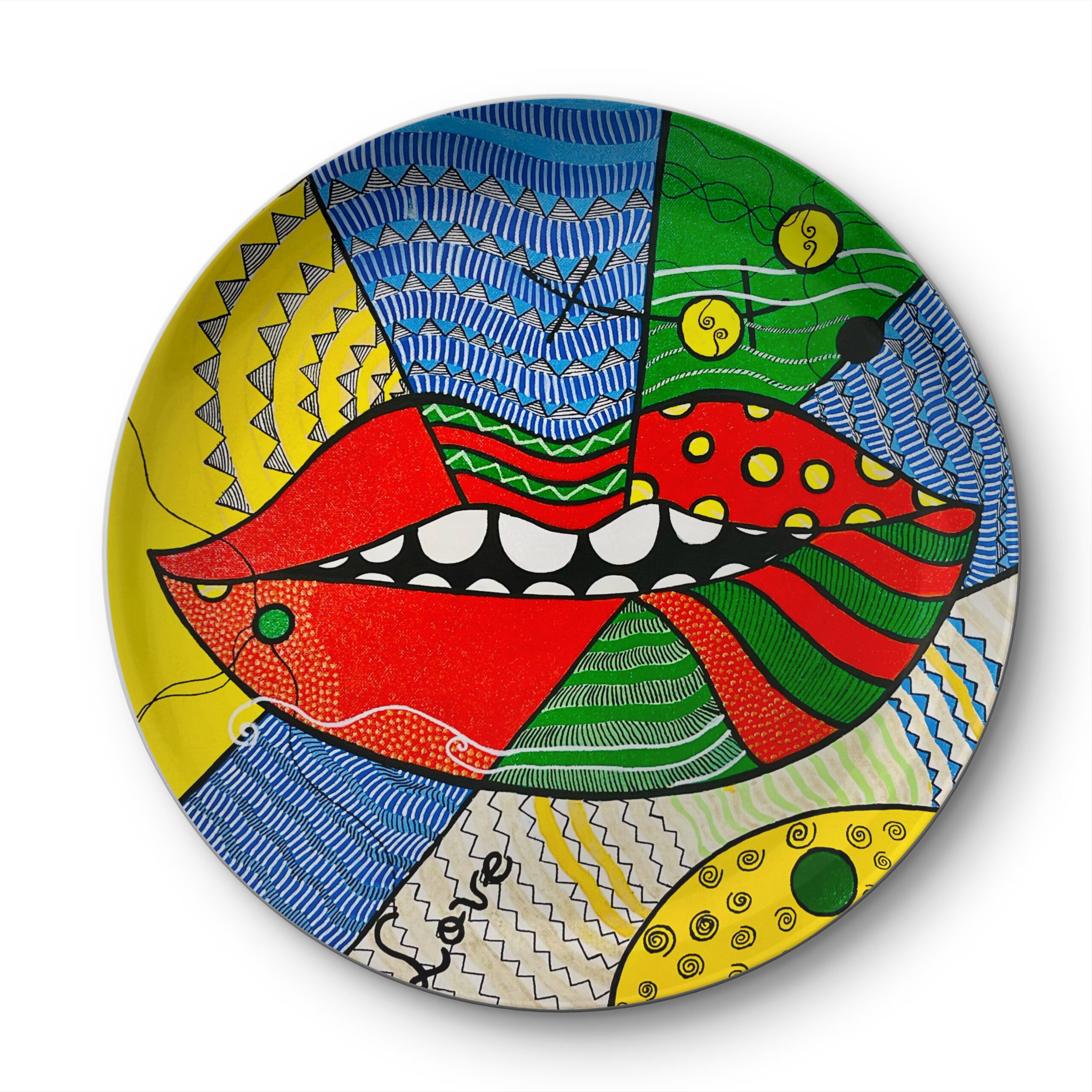 La bouche — peinture pop‑abstraite centrée sur des lèvres rouges et des dents stylisées, entourées de sections géométriques et motifs colorés; contrastes vifs, textures variées et l’inscription manuscrite «Love» ajoutent une dimension émotionnelle et ludique, invitant à une lecture à la fois sensuelle et graphique, parfaite pour une collection contemporaine ou une exposition thématique.