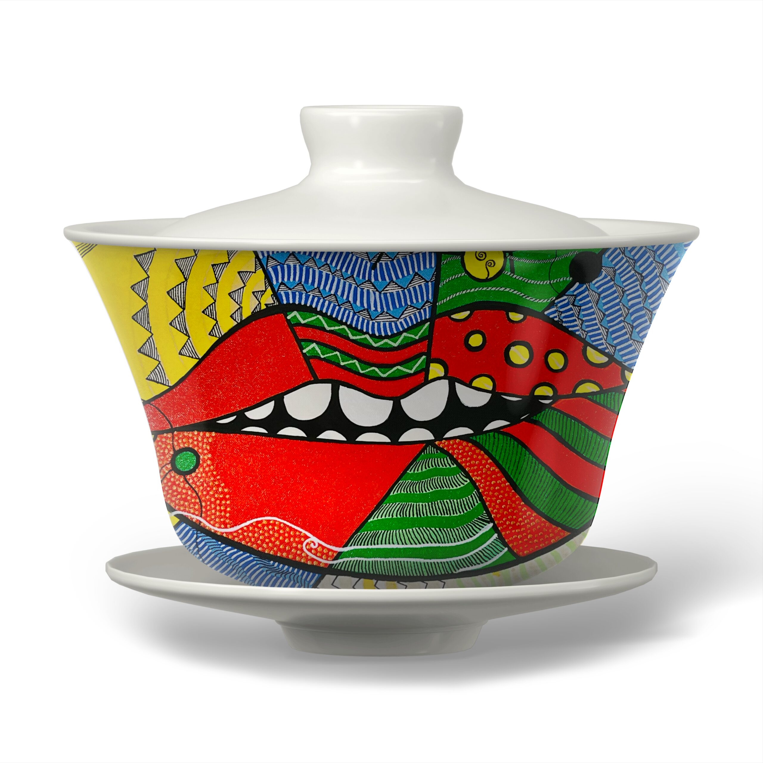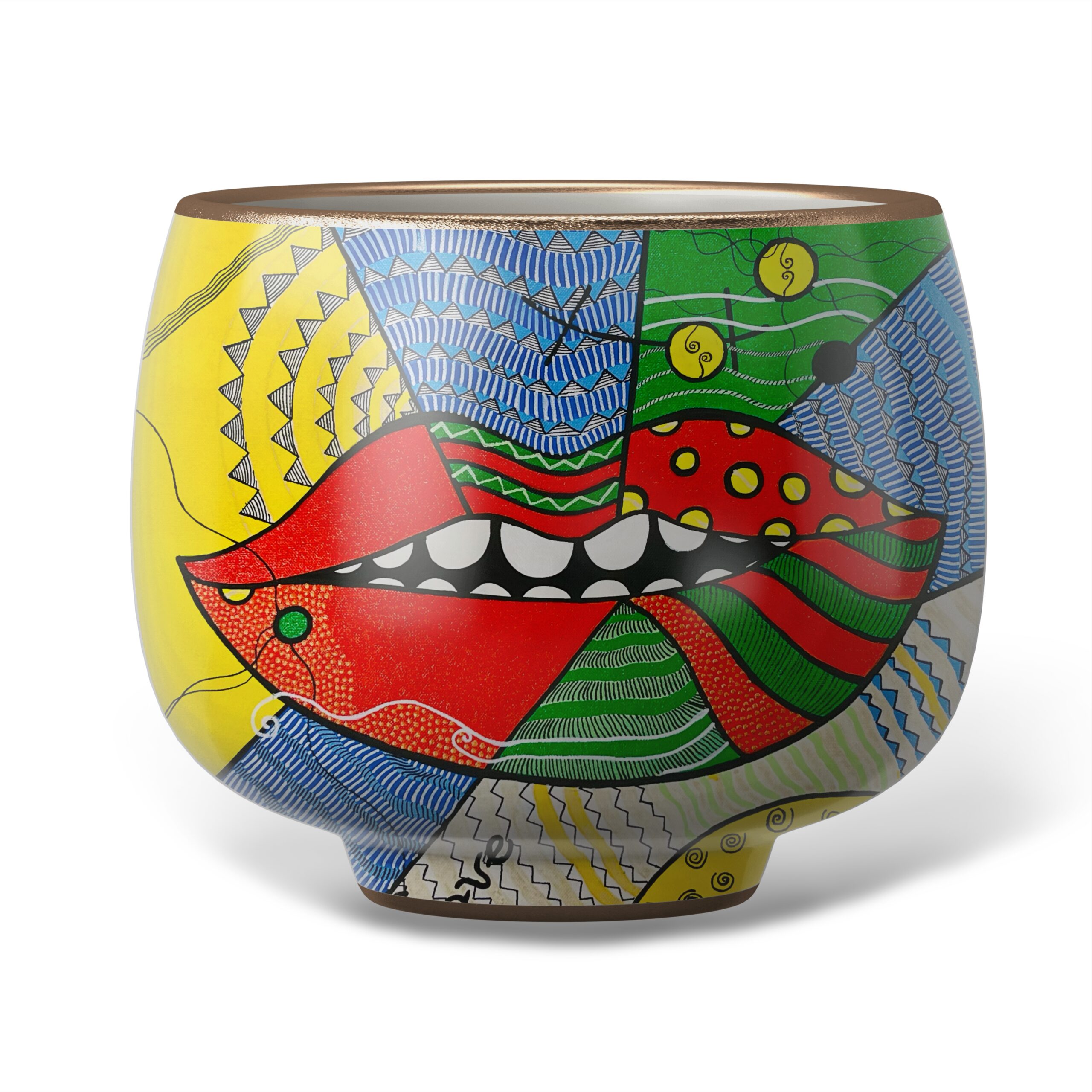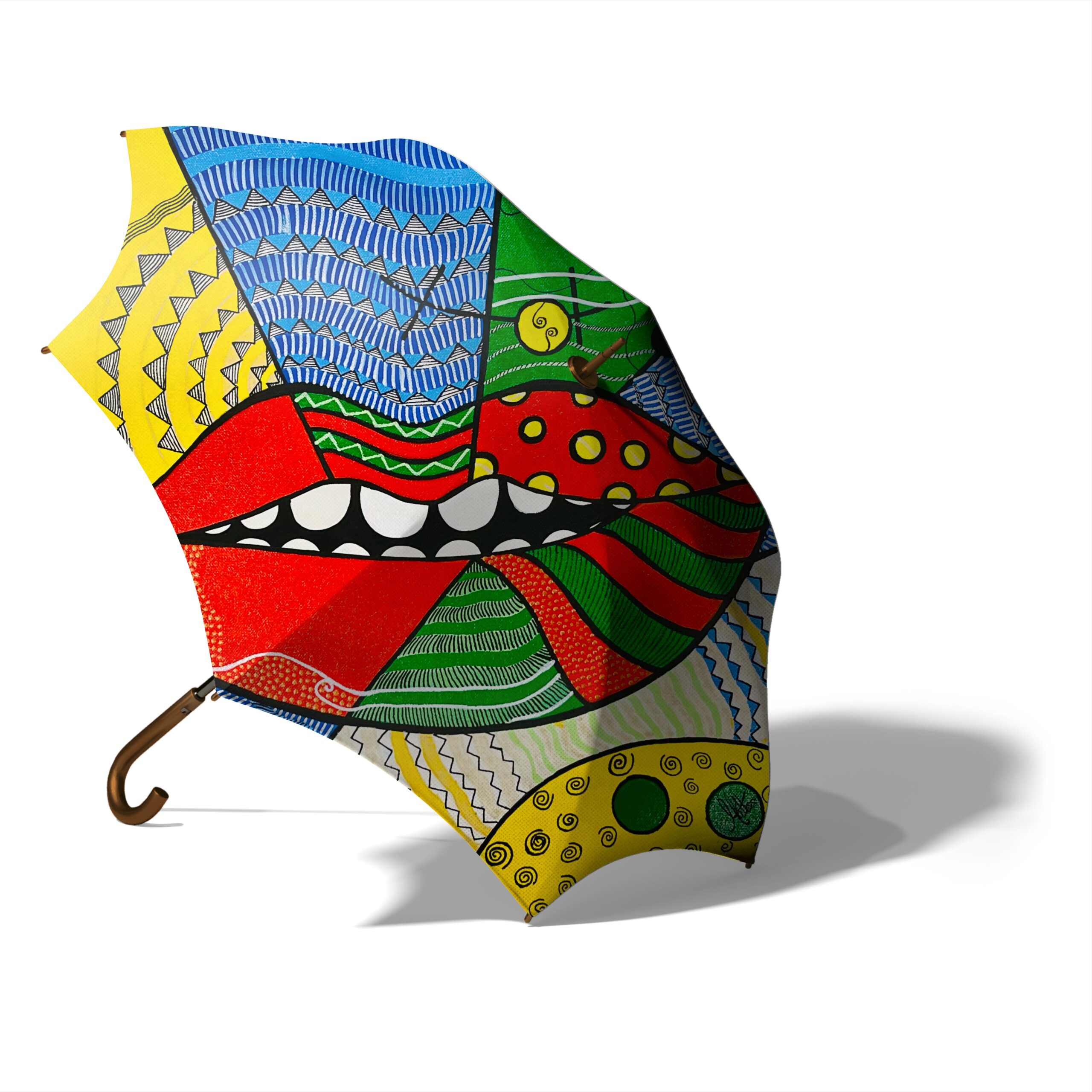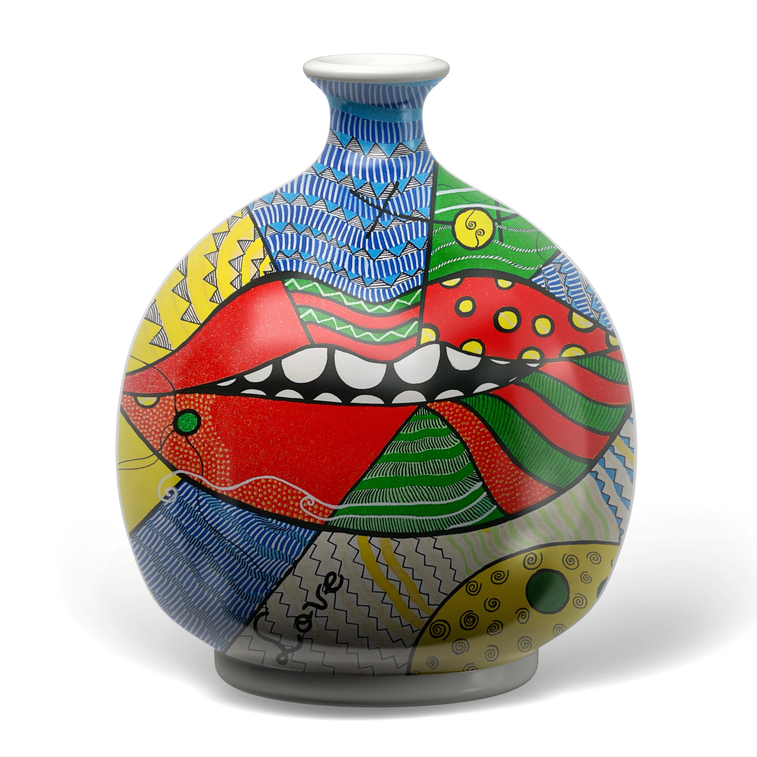 La bouche — peinture pop‑abstraite centrée sur des lèvres rouges et des dents stylisées, entourées de sections géométriques et motifs colorés; contrastes vifs, textures variées et l’inscription manuscrite «Love» ajoutent une dimension émotionnelle et ludique, invitant à une lecture à la fois sensuelle et graphique, parfaite pour une collection contemporaine ou une exposition thématique.