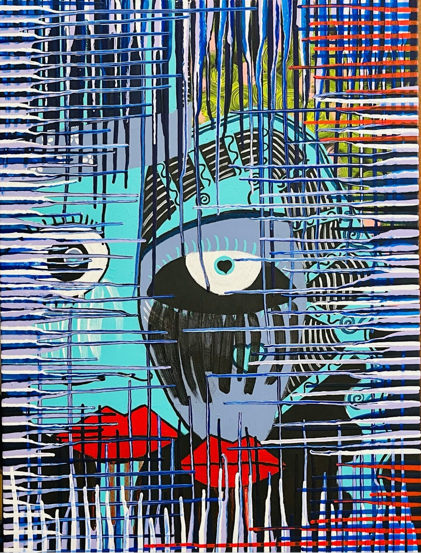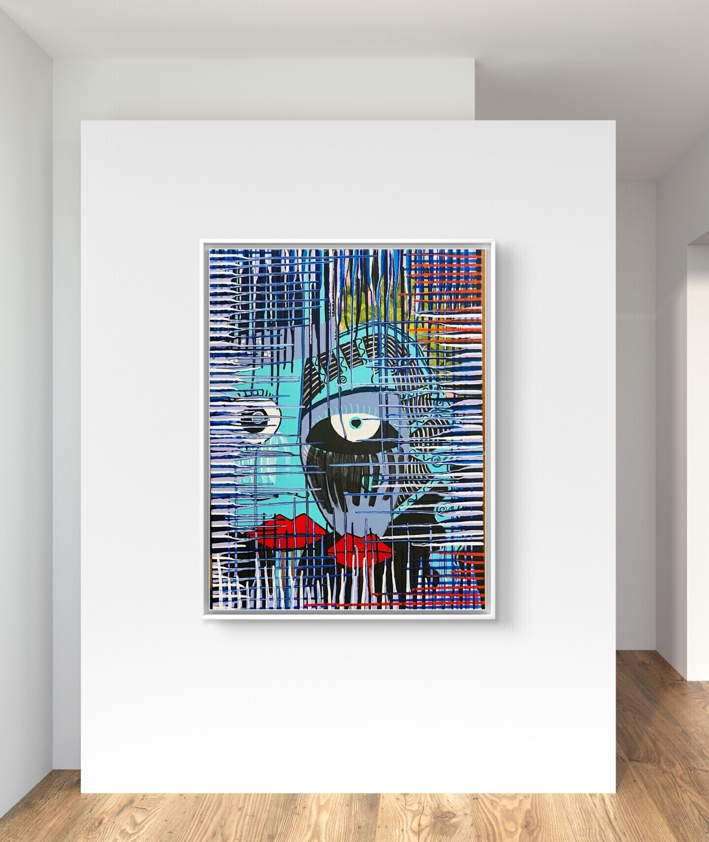 Le couple — peinture abstraite et expressive où visages stylisés, motifs géométriques et couleurs vives composent une scène chargée d’émotion; tension, tendresse et symboles se mêlent pour interroger les liens intimes et la communication entre deux êtres, offrant une lecture contemporaine et poétique adaptée à une collection ou une exposition thématique.