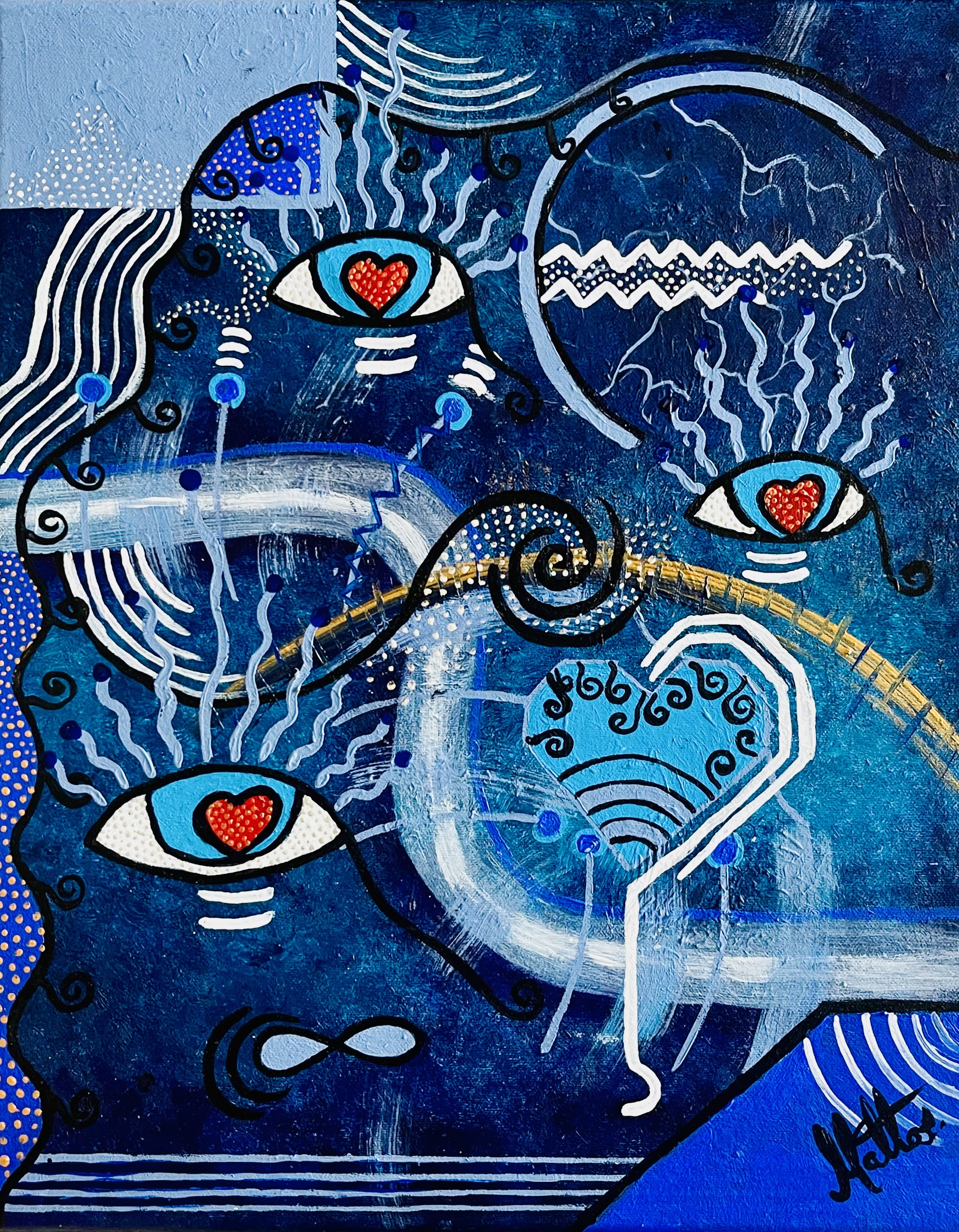 Les regards — peinture abstraite centrée sur trois yeux stylisés, chacun animé d’un cœur rouge en guise d’iris, comme trois points de vue émotionnels qui se répondent. Les lignes ondulées et les motifs dynamiques créent une circulation d’énergie autour d’un grand cœur bleu placé en bas, véritable noyau affectif qui relie l’ensemble. La palette dominée par les bleus, ponctuée de noir, de blanc et de rouge, installe une atmosphère vibrante où perception, amour et connexion se mêlent.