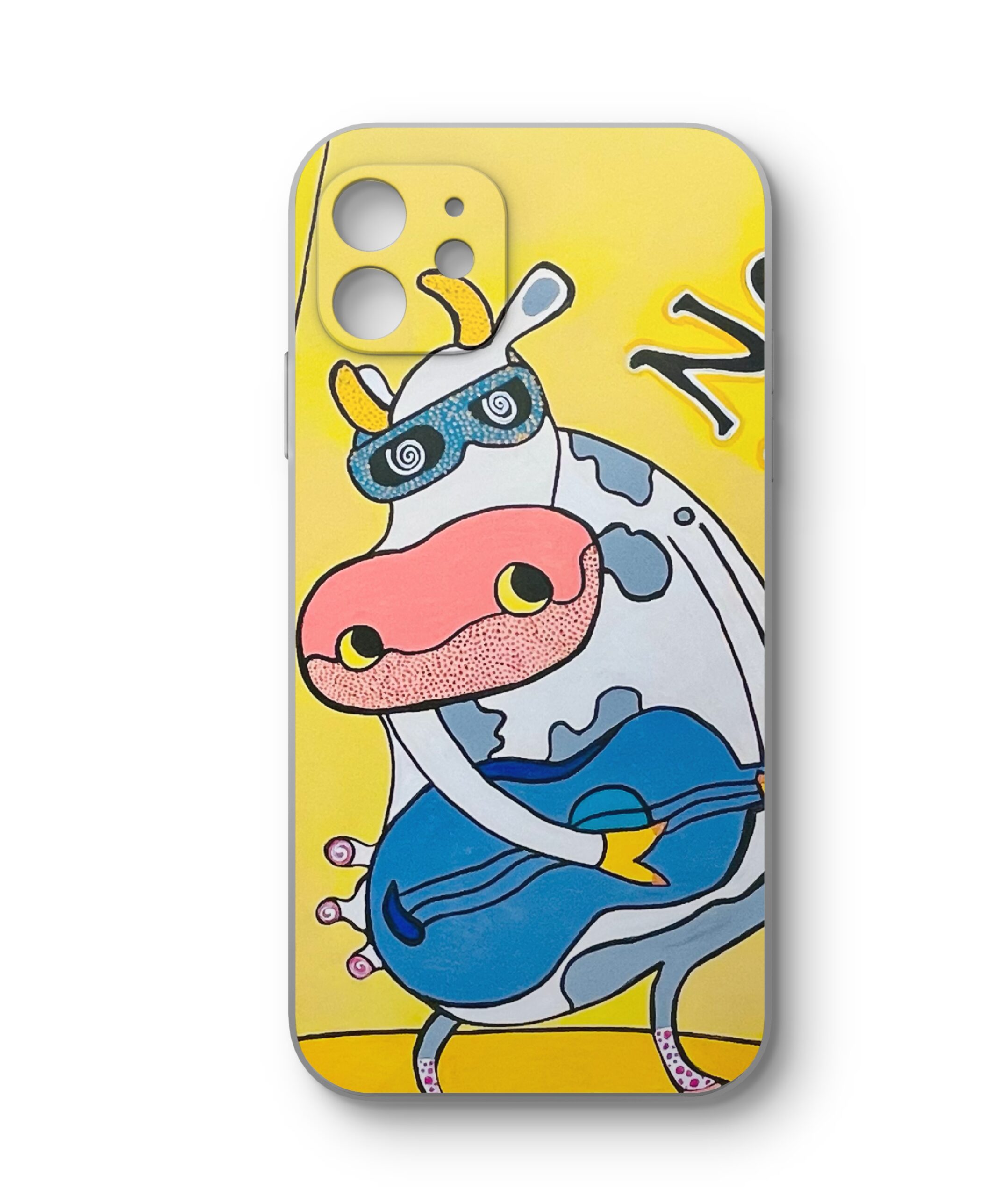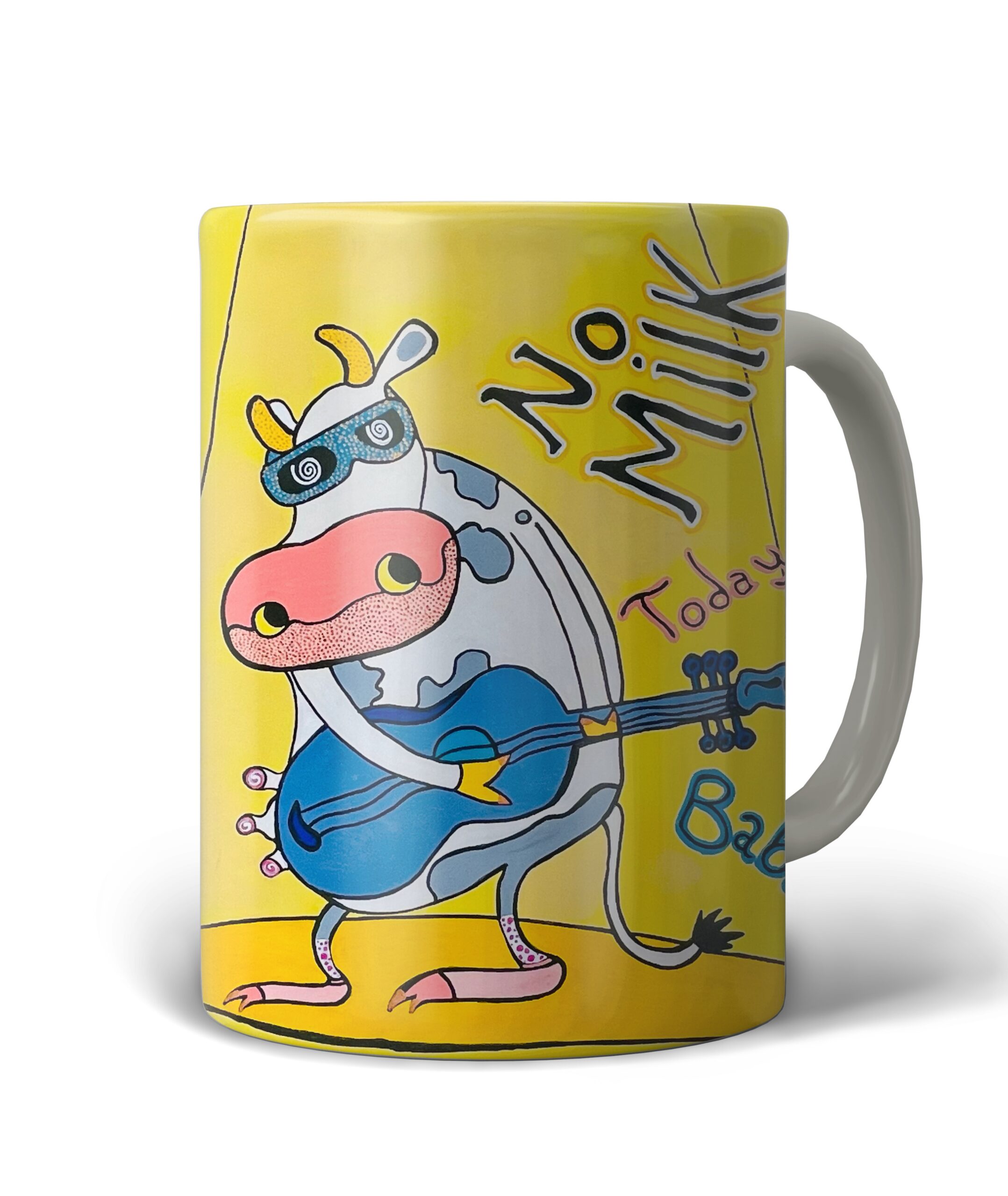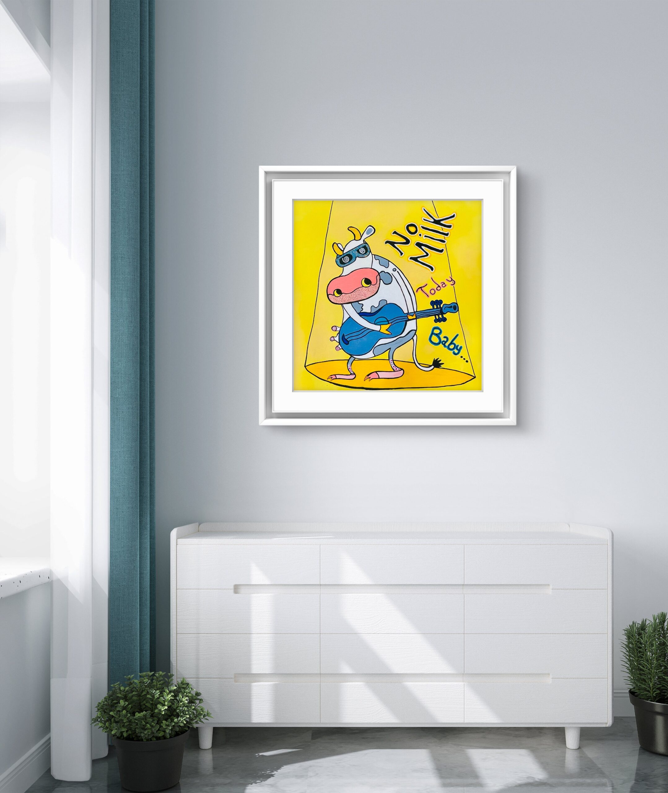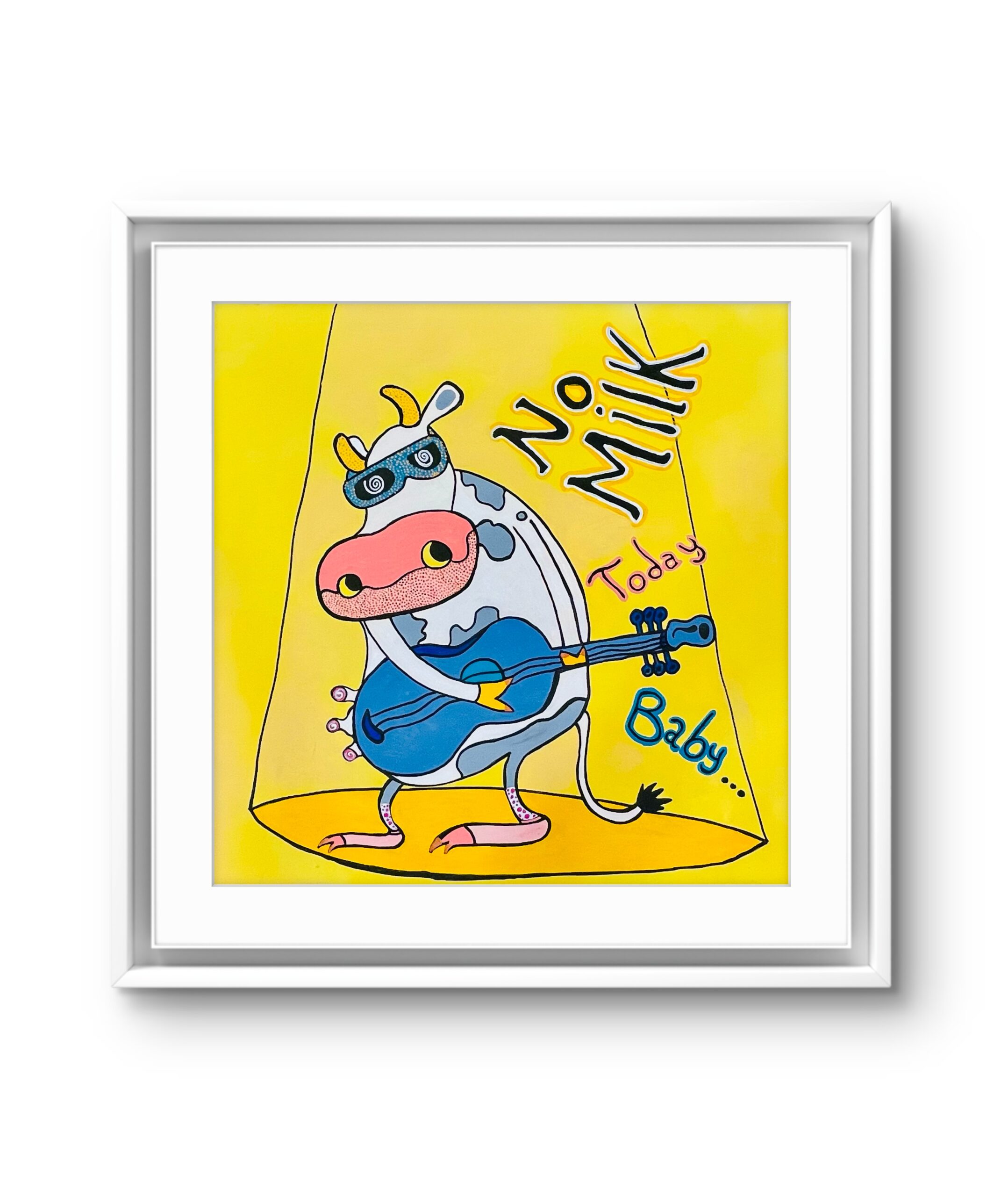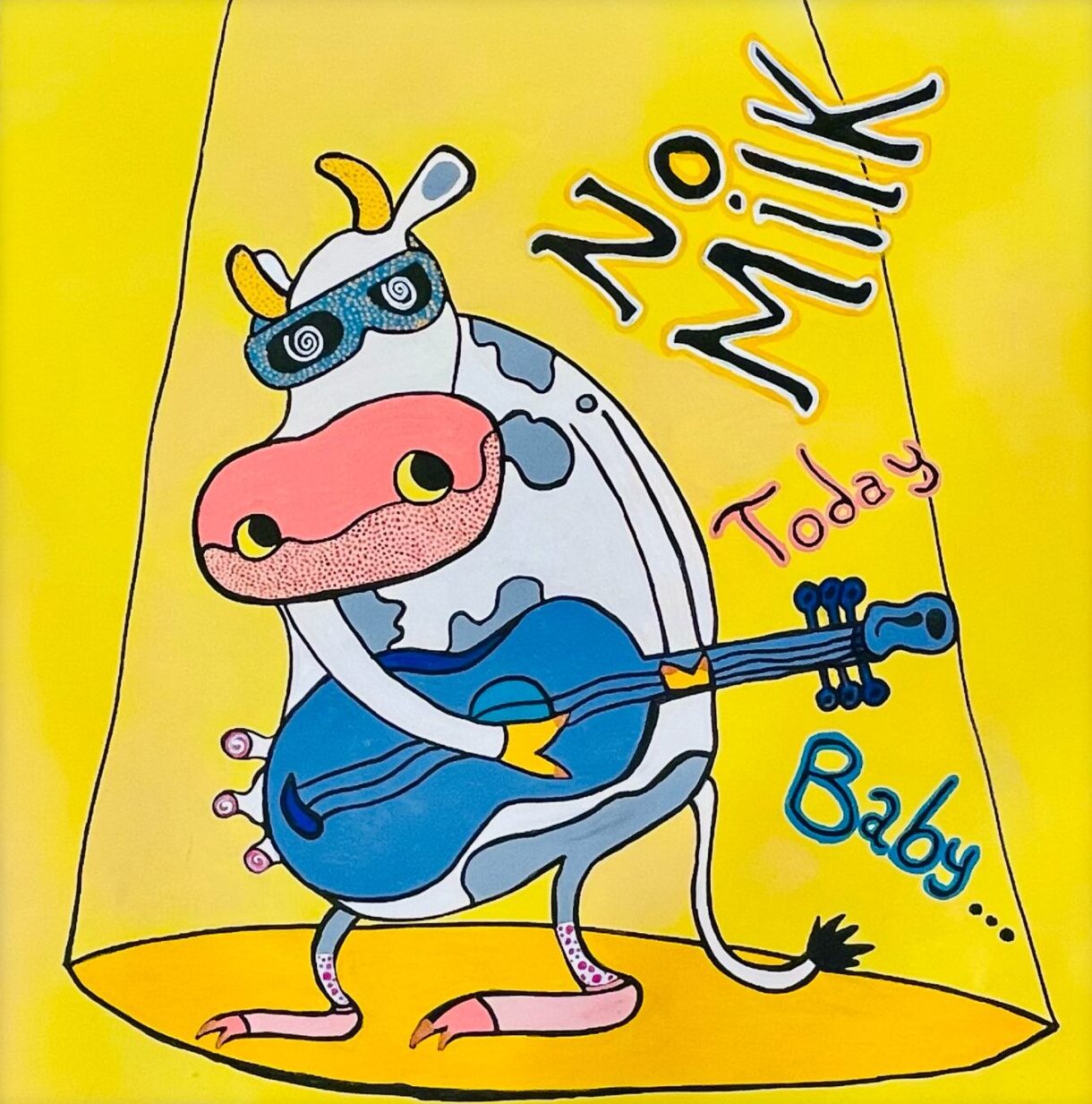 No Milk Today — affiche pop et humoristique représentant une vache rockeuse sous un spot, lunettes bleues et guitare; composition ludique et colorée mêlant ironie et charme rétro, parfaite pour une décoration murale contemporaine, un cadeau décalé ou une exposition d’art graphique.