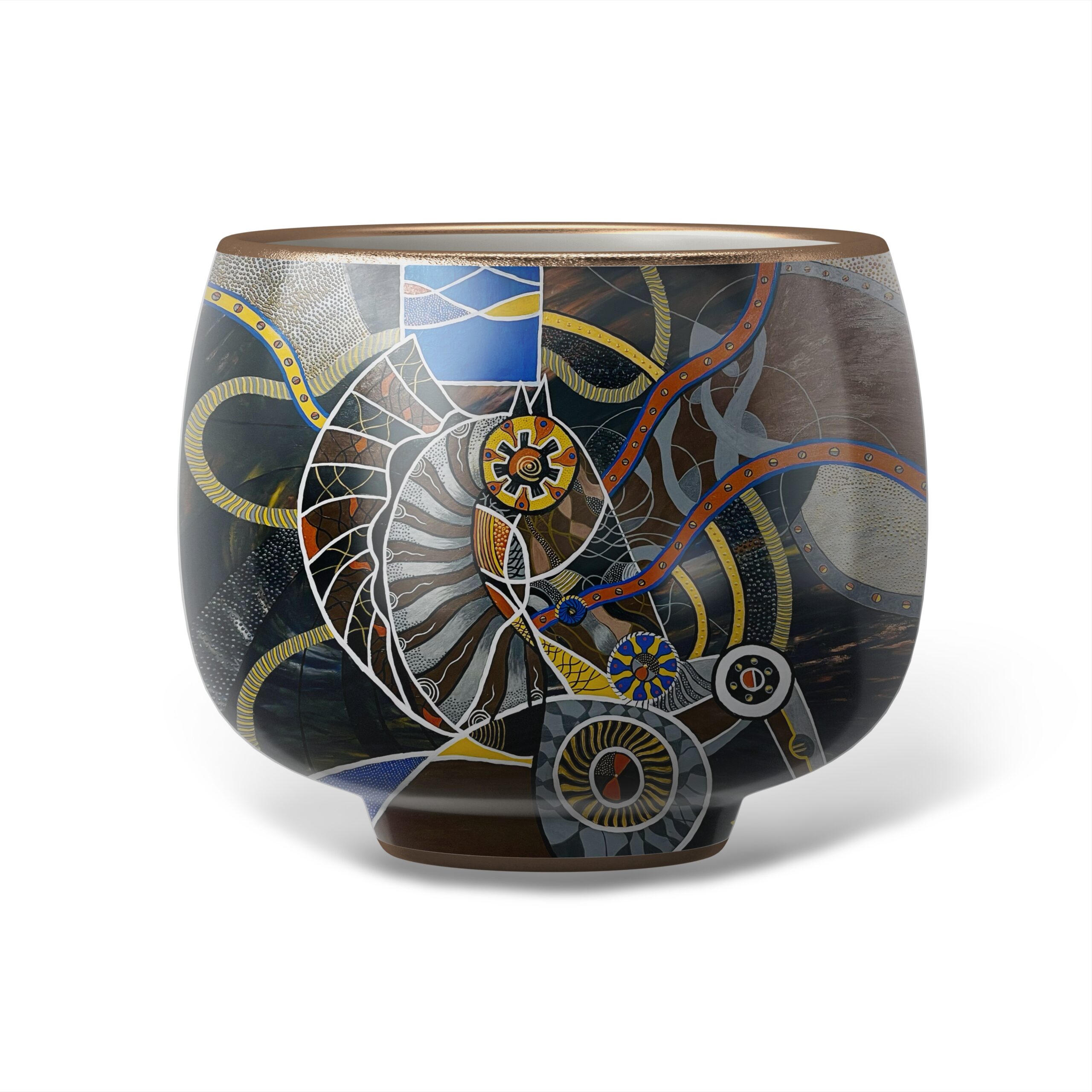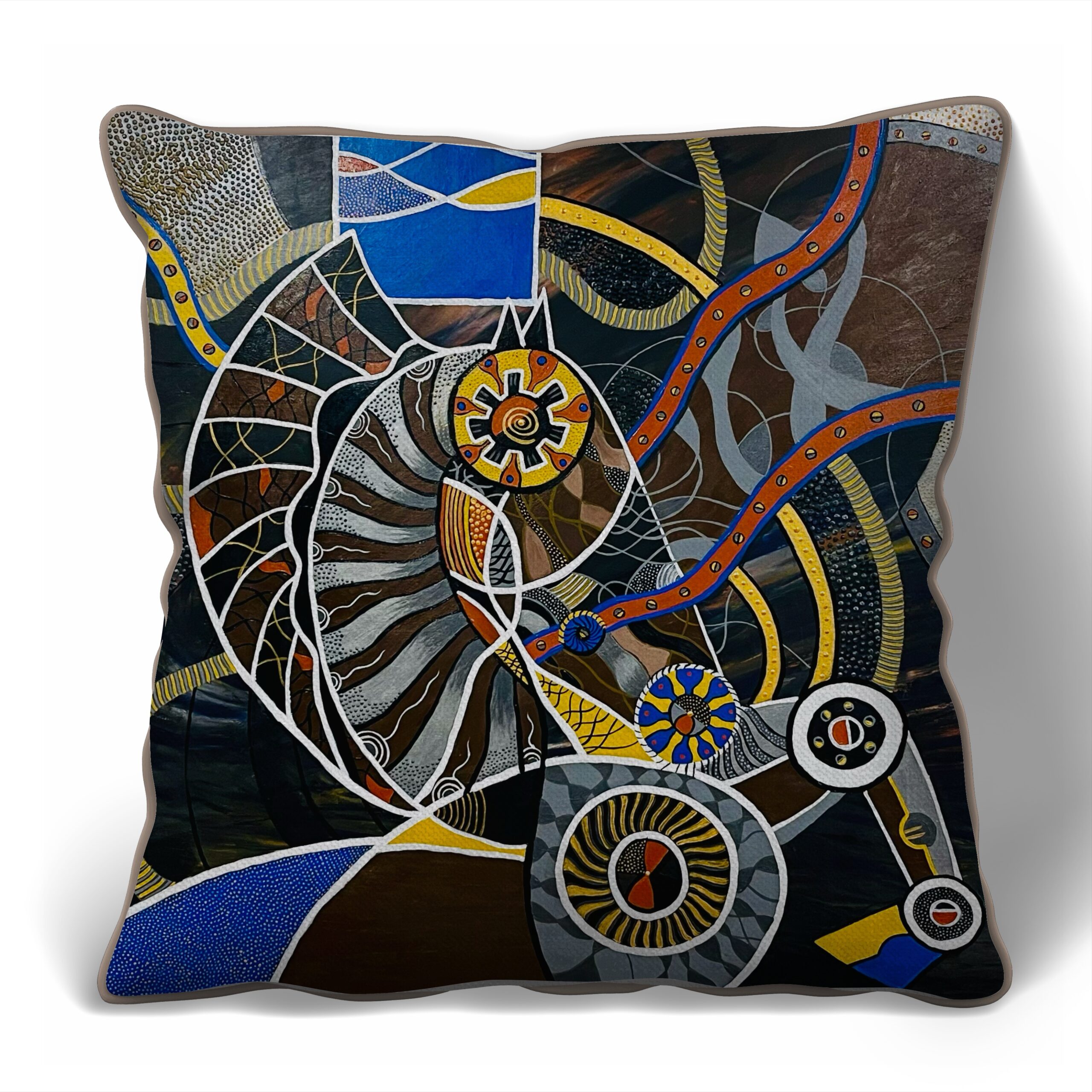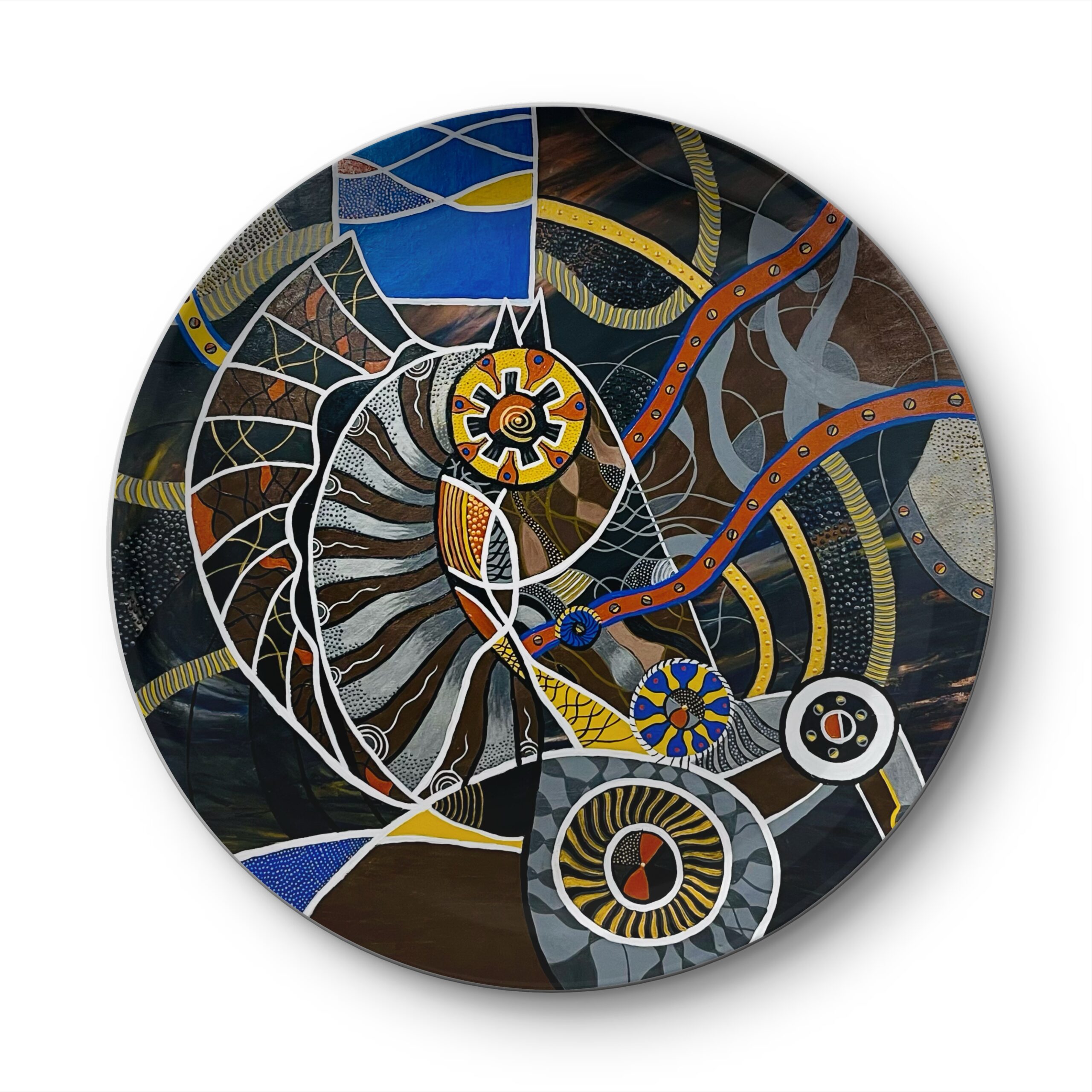 Troya 2 — peinture abstraite et foisonnante où une spirale centrale évoquant turbine ou coquille s’articule avec engrenages, tuyaux et motifs organiques; la segmentation par lignes blanches et le travail de points et de traits créent une tension rythmique entre mécanique et vivant, tandis qu’une palette de bleus, jaunes et ocres confère profondeur et dynamisme. Œuvre idéale pour interroger la rencontre entre technologie et nature au sein d’une collection contemporaine.