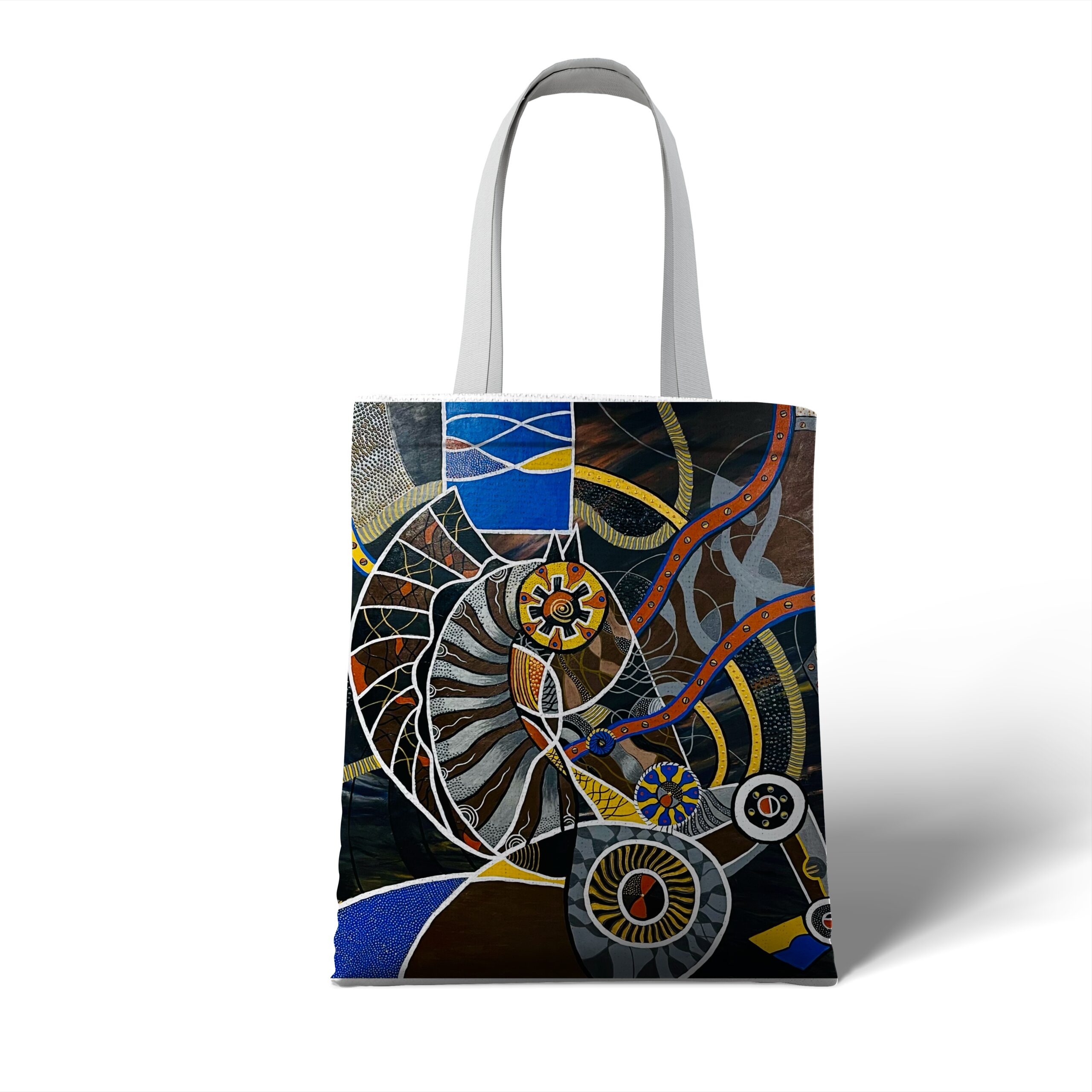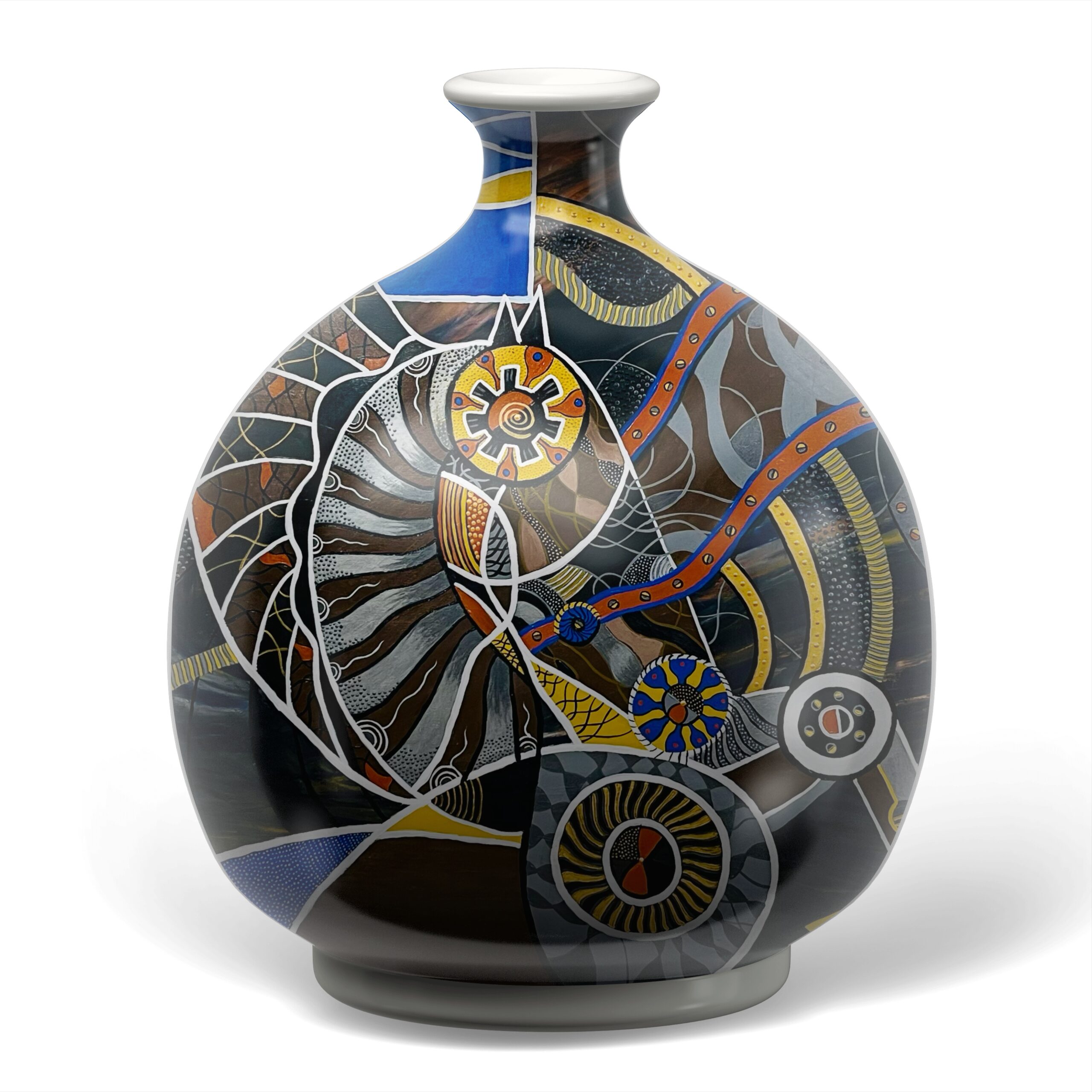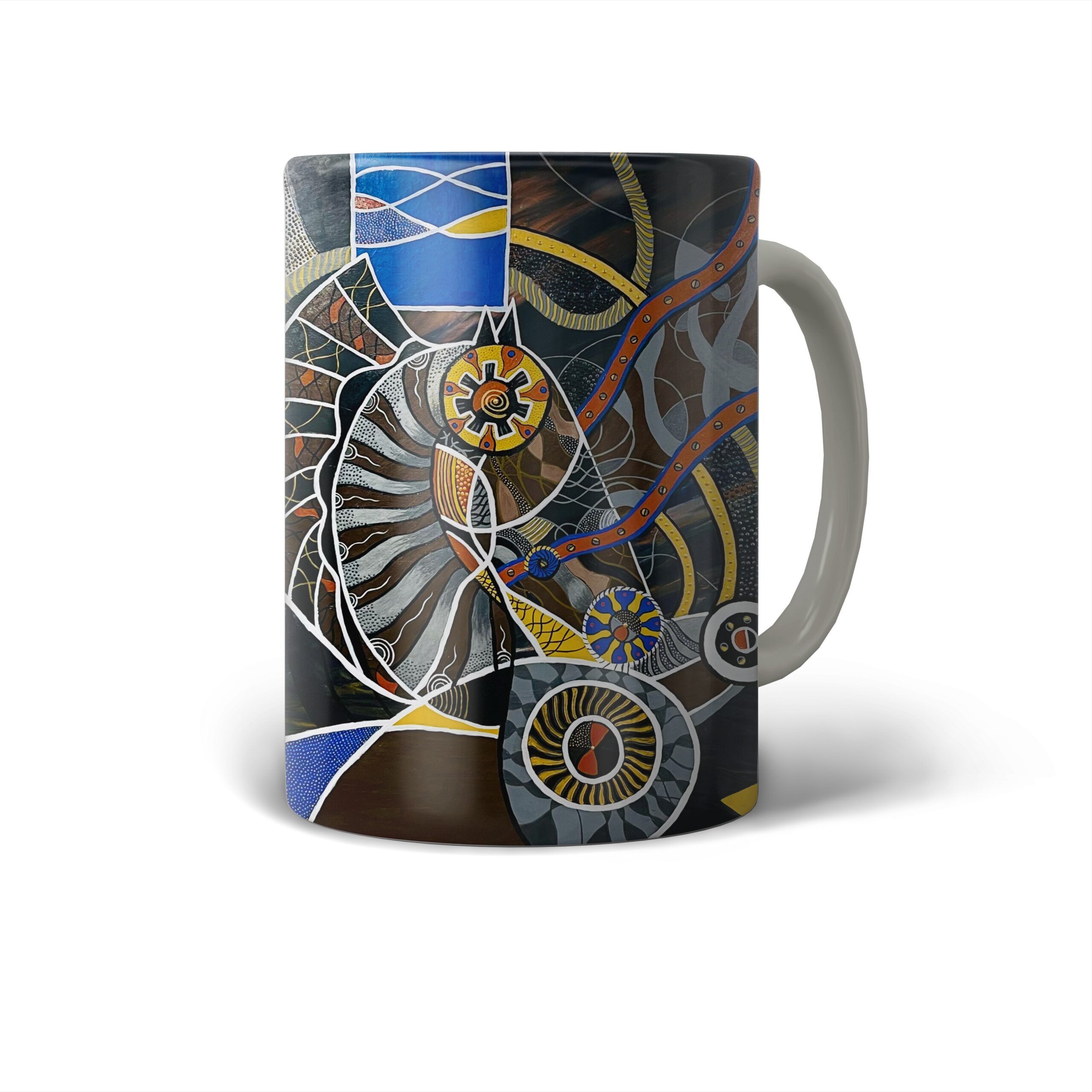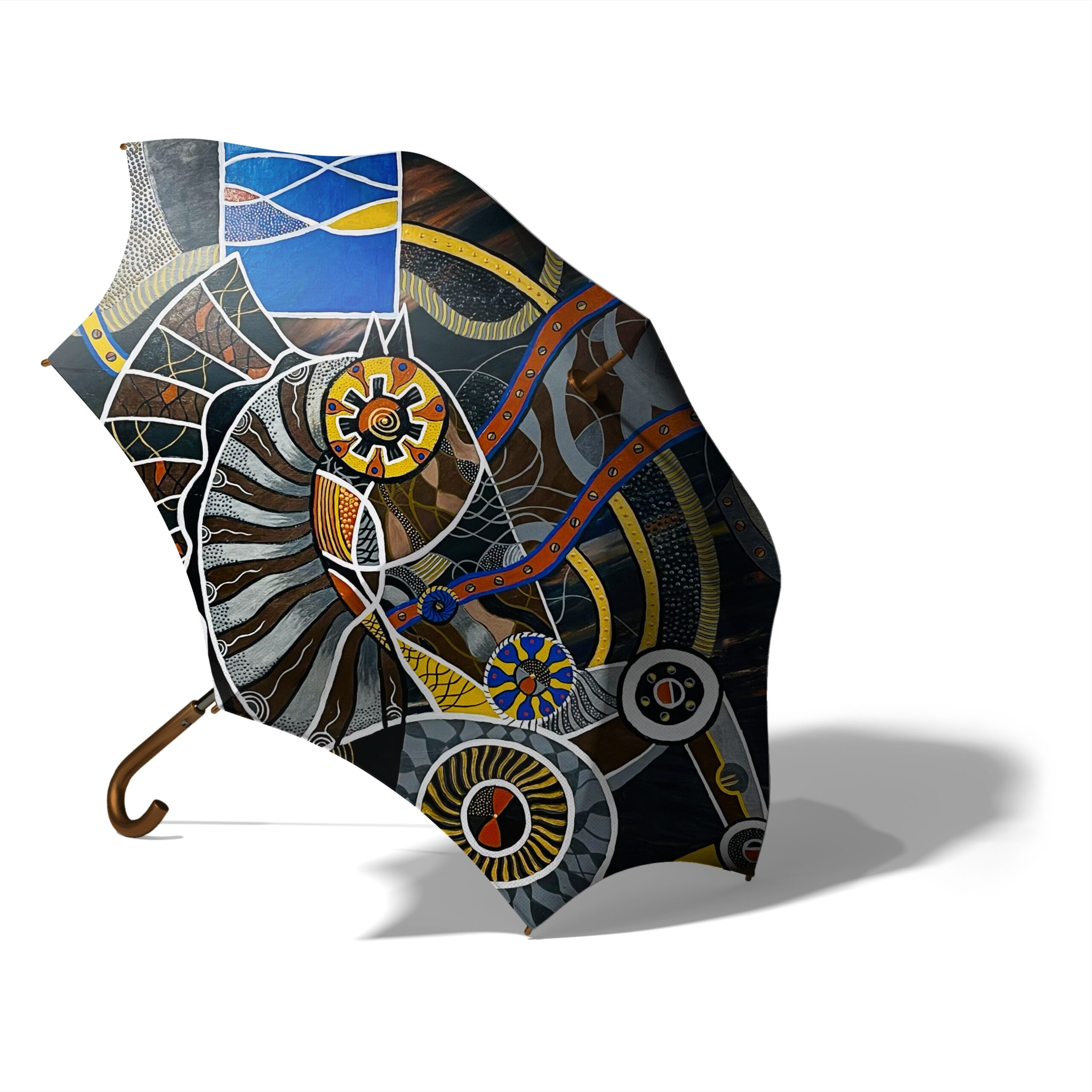 Troya 2 — peinture abstraite et foisonnante où une spirale centrale évoquant turbine ou coquille s’articule avec engrenages, tuyaux et motifs organiques; la segmentation par lignes blanches et le travail de points et de traits créent une tension rythmique entre mécanique et vivant, tandis qu’une palette de bleus, jaunes et ocres confère profondeur et dynamisme. Œuvre idéale pour interroger la rencontre entre technologie et nature au sein d’une collection contemporaine.